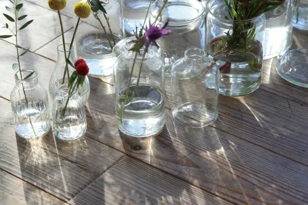 【口が広くて活けやすいリューズガラスのフラワーベース】