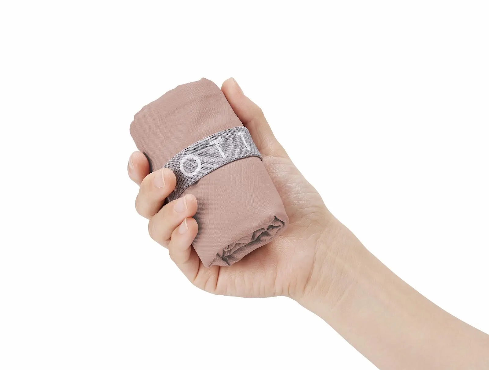 ナイロンのような滑らかな手触りで、くるりと丸めてゴムバンドでとめると、手のひらに収まるほどのコンパクトサイズで持ち運べるエコバッグ。