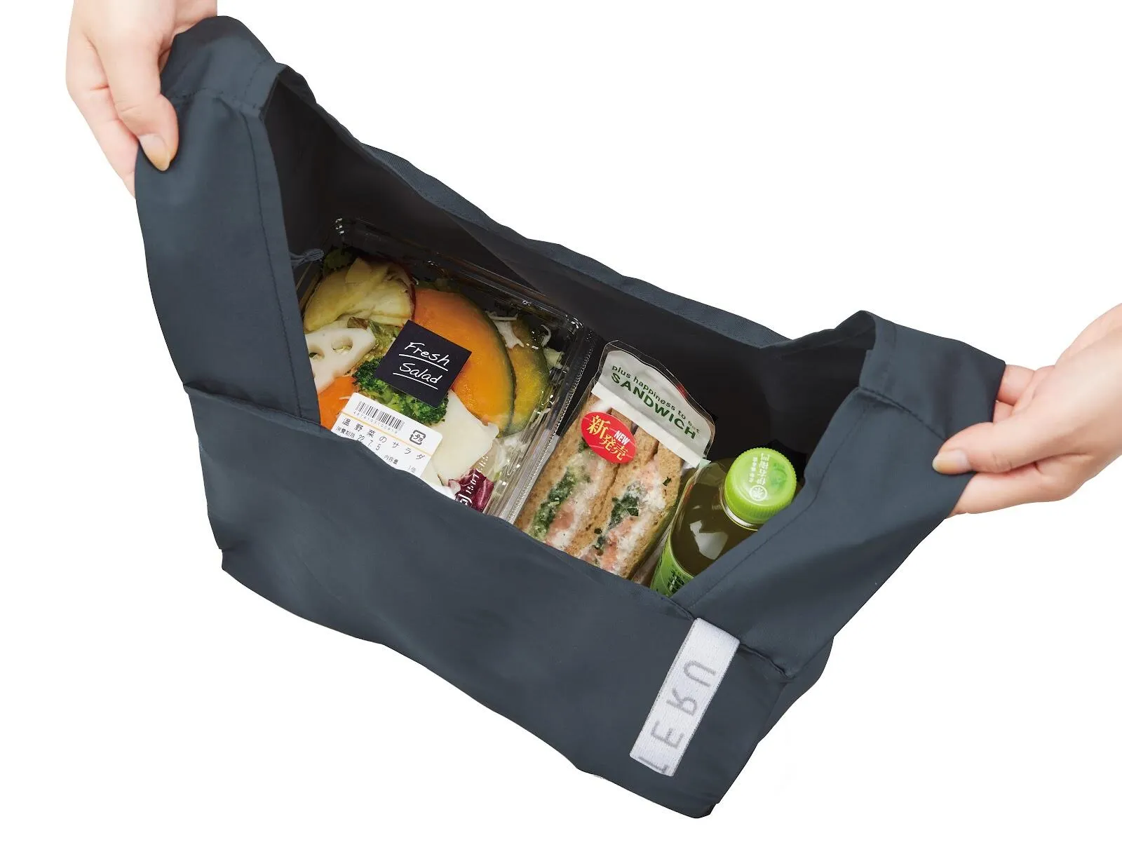 ハンカチのようにポケットに入れられて、広げればマチがありコンビニのお弁当も真っ直ぐ入れられます。手の大きな男性の指が4本入る幅広の持ち手、プリーツ加工でたたみやすいなど、男性が男性のために考えた使いやすさになっています。