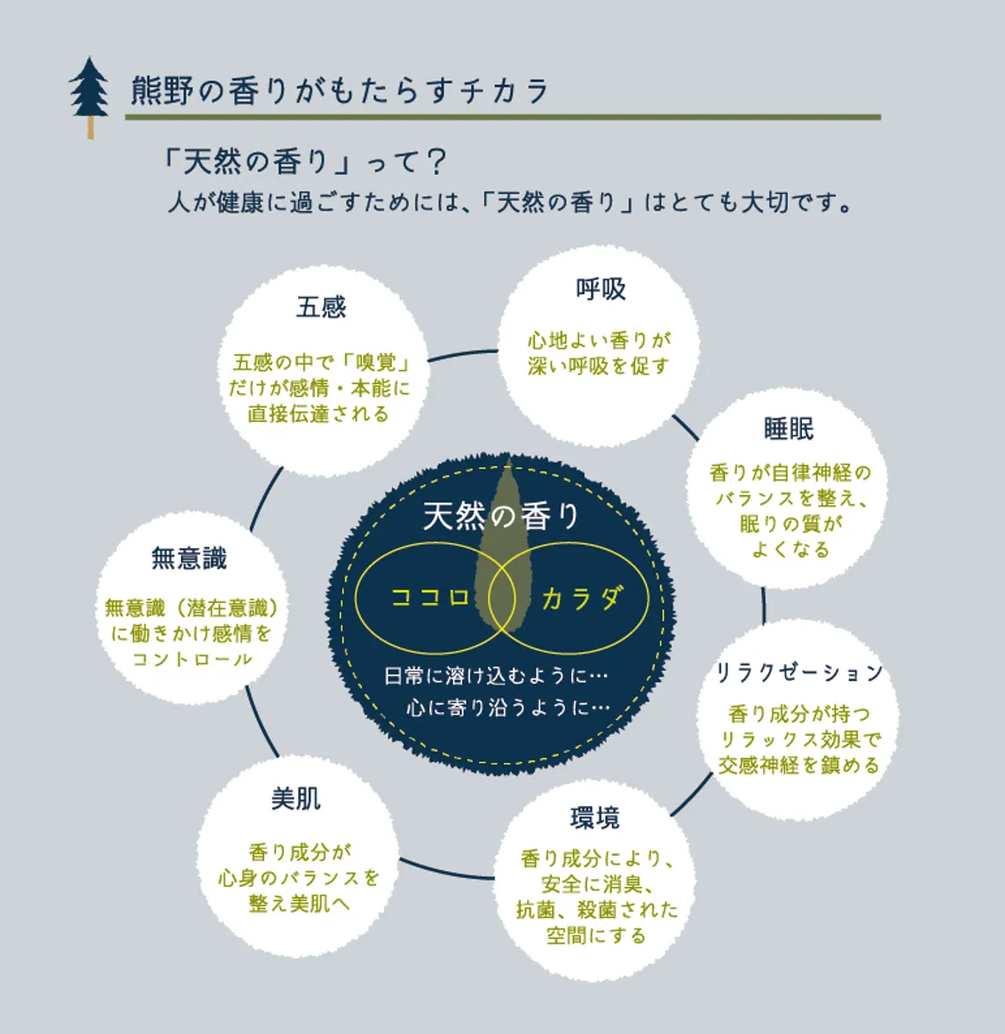私たちが熊野の森に立った時の心地良い感覚、間伐や植物に触れている瞬間の上質な自然の香りを、日常の中で感じ健やかになってもらえるのが熊野の香りの特徴です。