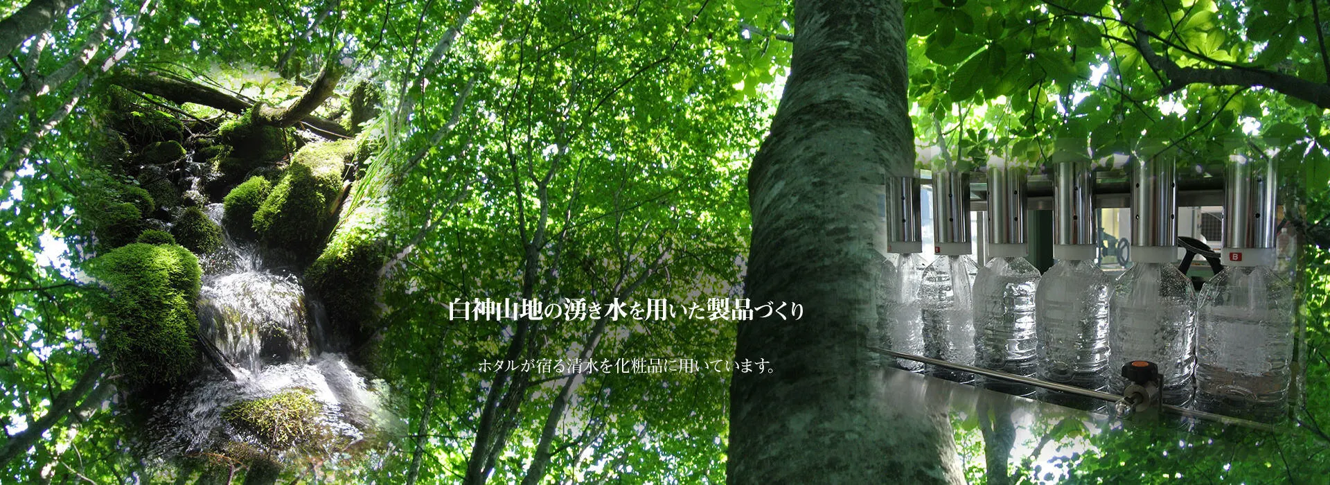 スキンケア商品にはいくつもの成分が含まれていますが、ボトルの中身の多くを占める材料は水です。ヒトの身体も水分が50~60%(成人)を占めています。大切なお肌につけるものだから、安全で清らかな水を使った化粧品を作りたいと私たちは考えました。