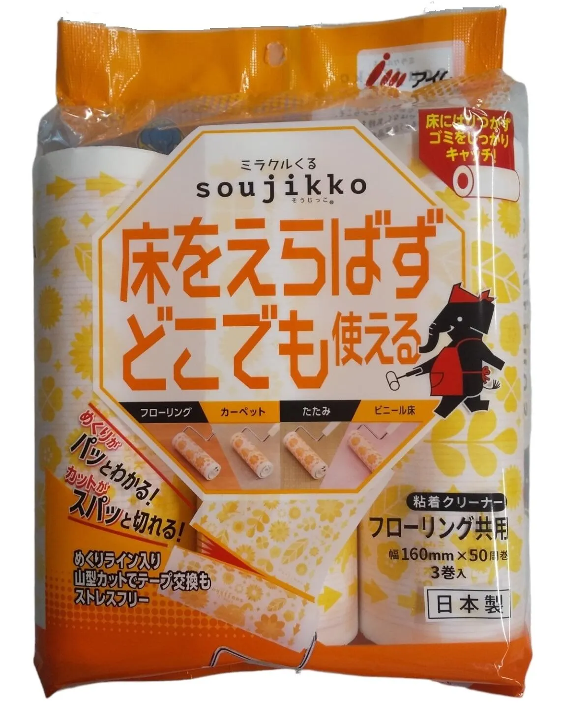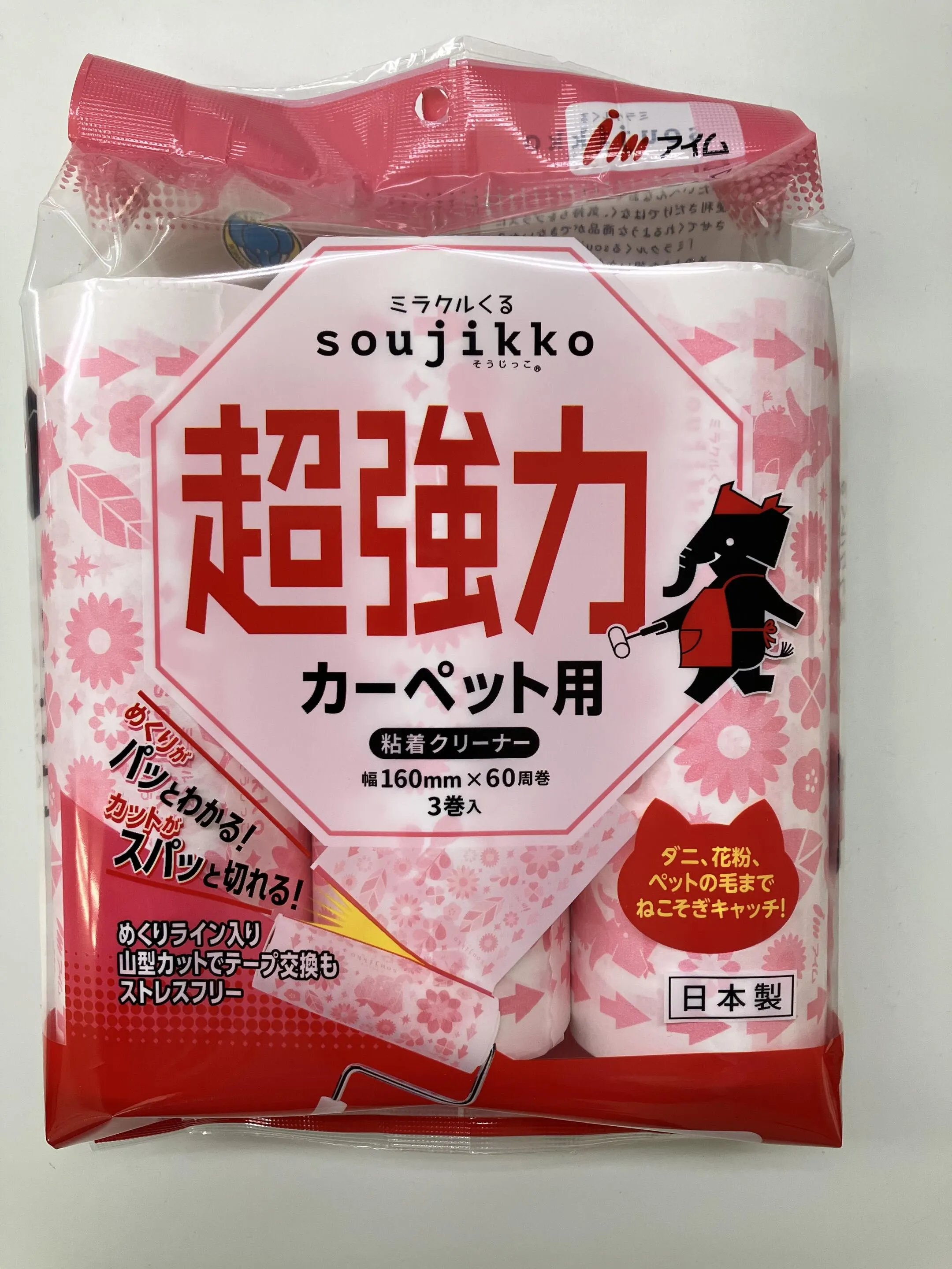 粘着クリーナーのsoujikkoシリーズは汚れても見えるめくり印刷、2枚めくれしない製法、左右どちらからでも軽い力でカットができる山型カット(特許取得)の基本機能がゴミを取るだけでなくゴミ箱までのイライラを解消できる標準仕様となってます。