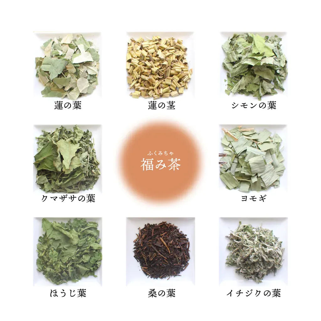 使用している葉:ほうじ茶、ヨモギの葉、蓮の葉、桑の葉、クマザサ、シモンの葉、イチジクの葉