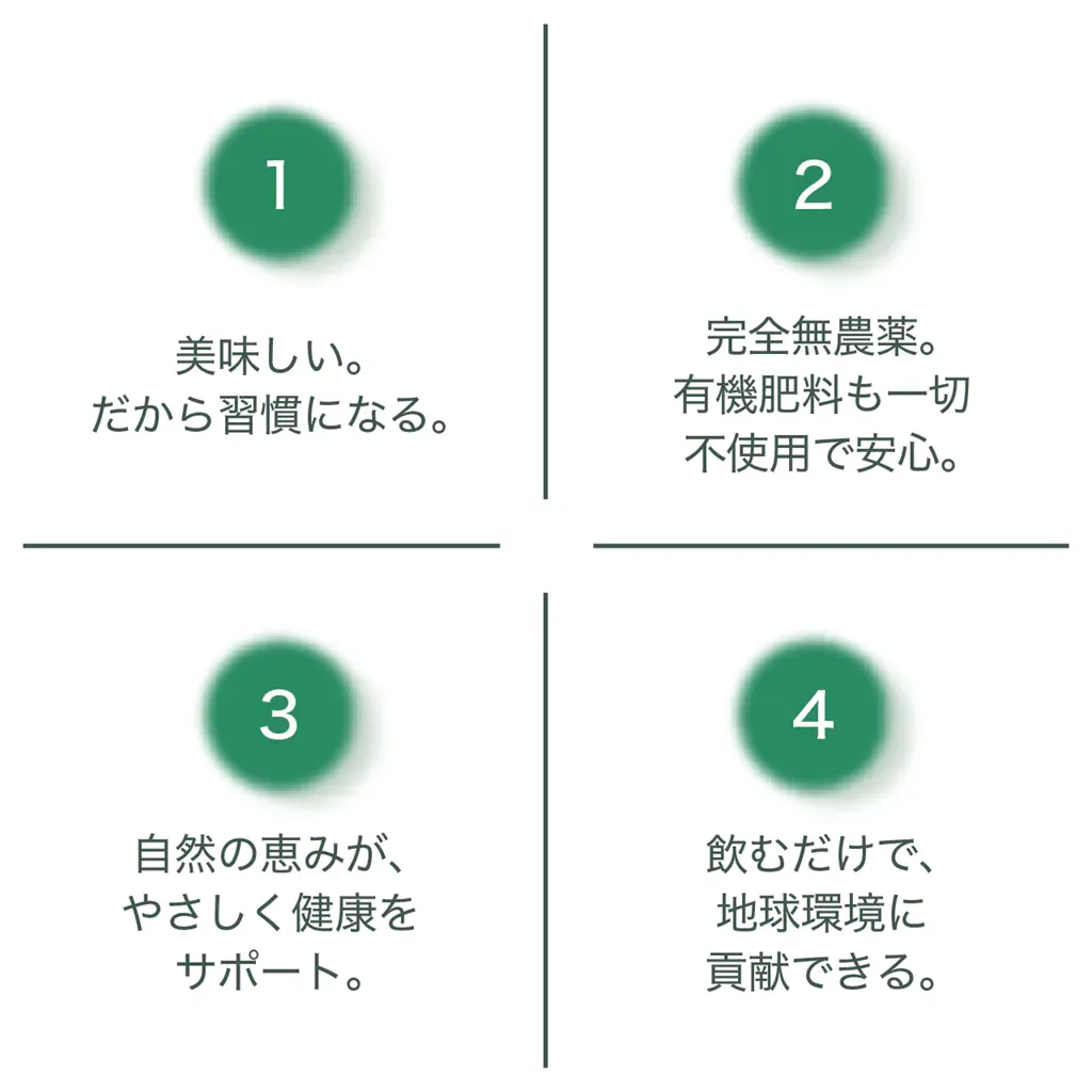 すべての送品が農薬や化学肥料不使用で栽培されており、7種類のお茶の葉すべてが静岡県のエコビレッジで生産されてるため海外ので栽培されたものと比べても流通にかかる二酸化炭素は限りなく低くできています。