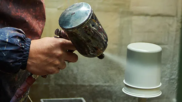 樹脂製品に機械では味わえない塗装の“垂れ“や”色ムラ“を取り入れ、陶器のようで陶器よりも取り扱いやすい製品作りを行なっている