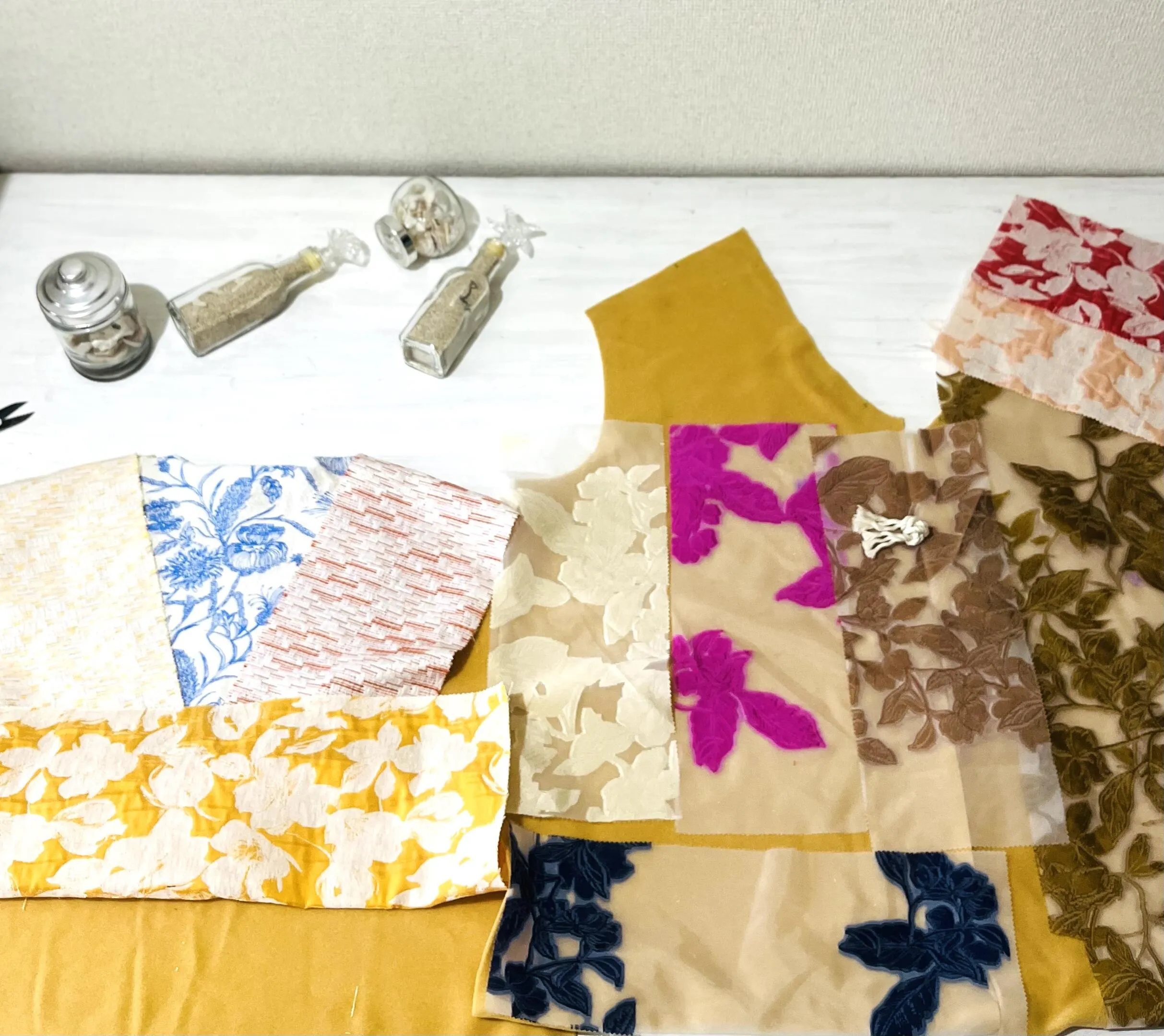 ノートにスクラップする様にパターンに切れ端たちをあてはめる作業が楽しく、1点ものを作る喜びを味わいながら作業しています。