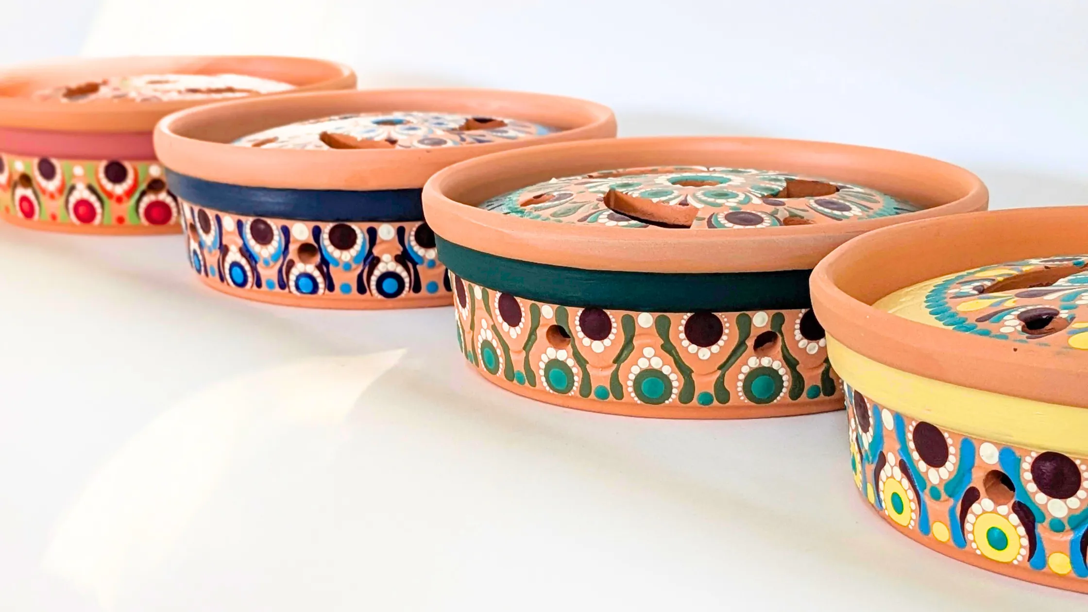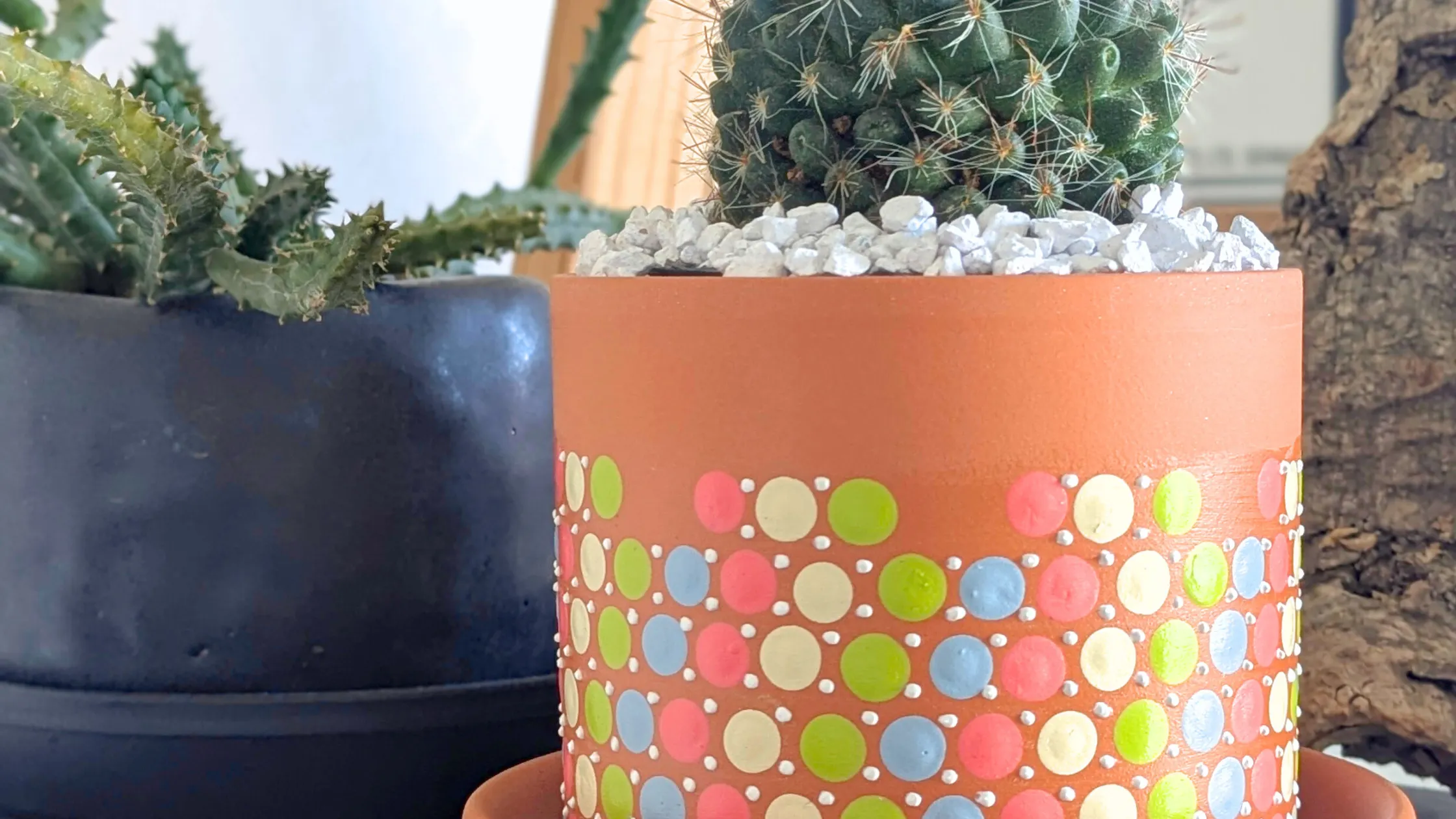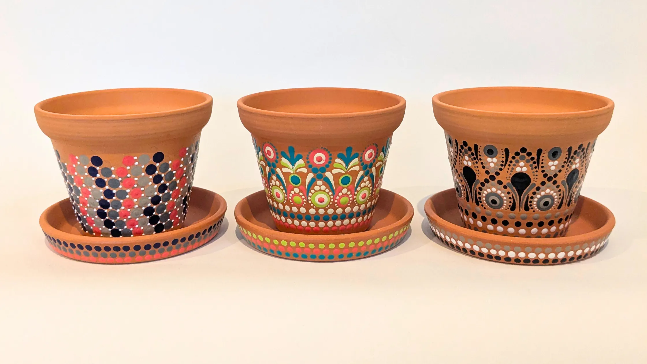 素焼きの植木鉢や器の自然な質感に、鮮やかなドット模様を組み合わせ、暮らしの中に彩りを添えます。 実用的でありながら、置くだけで空間が華やぐ“使えるアート”です。
