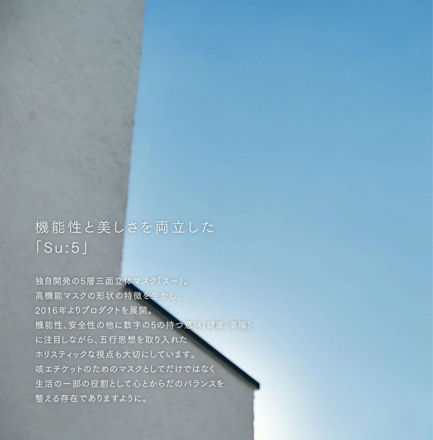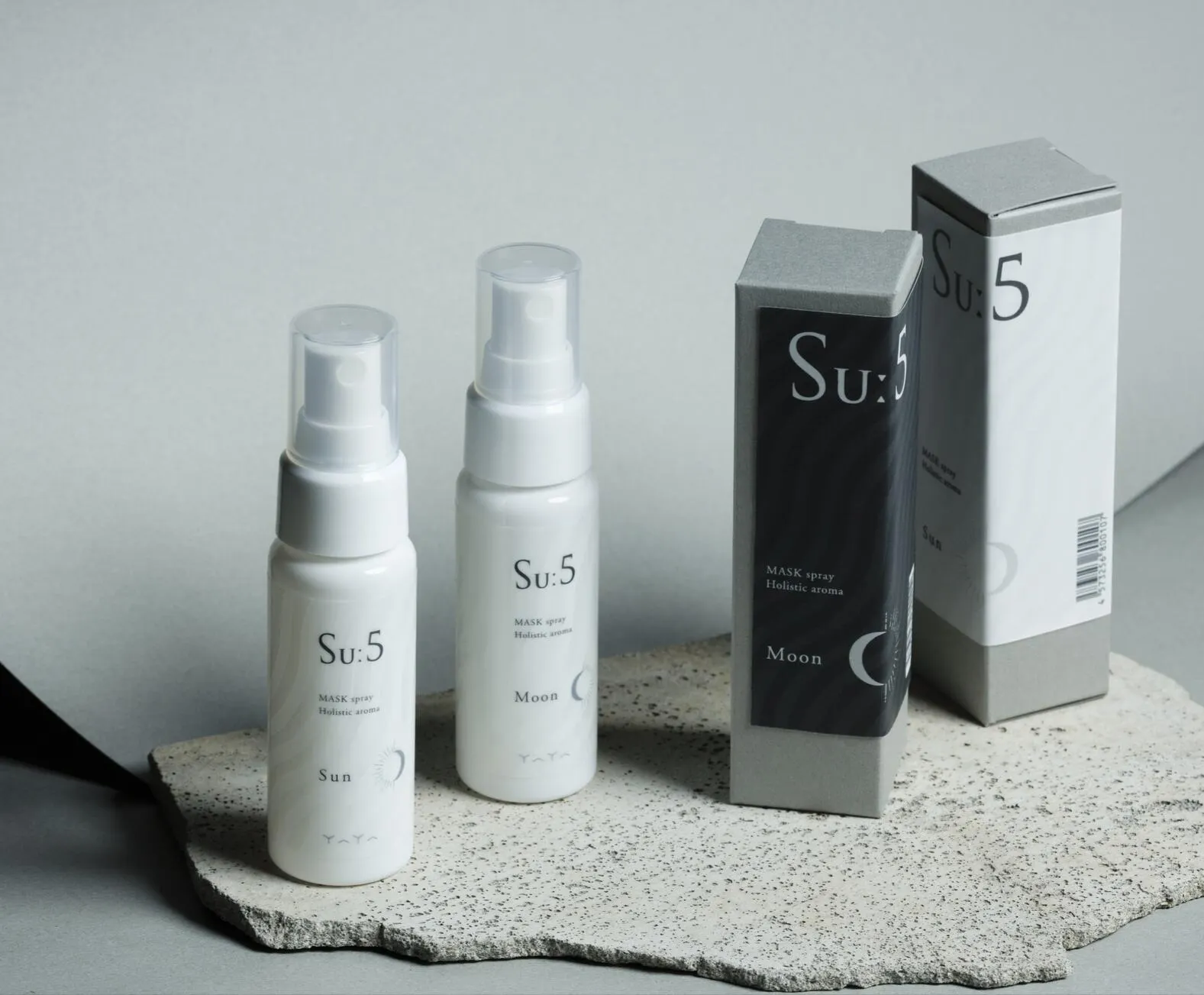 商品名のSuː5/スーは呼吸音、息の通り、心身が滞りなく開放する意味をスーと言う音になぞらえました。「5」は五感、自由などの意味を持ちその性質を取り入れてます。