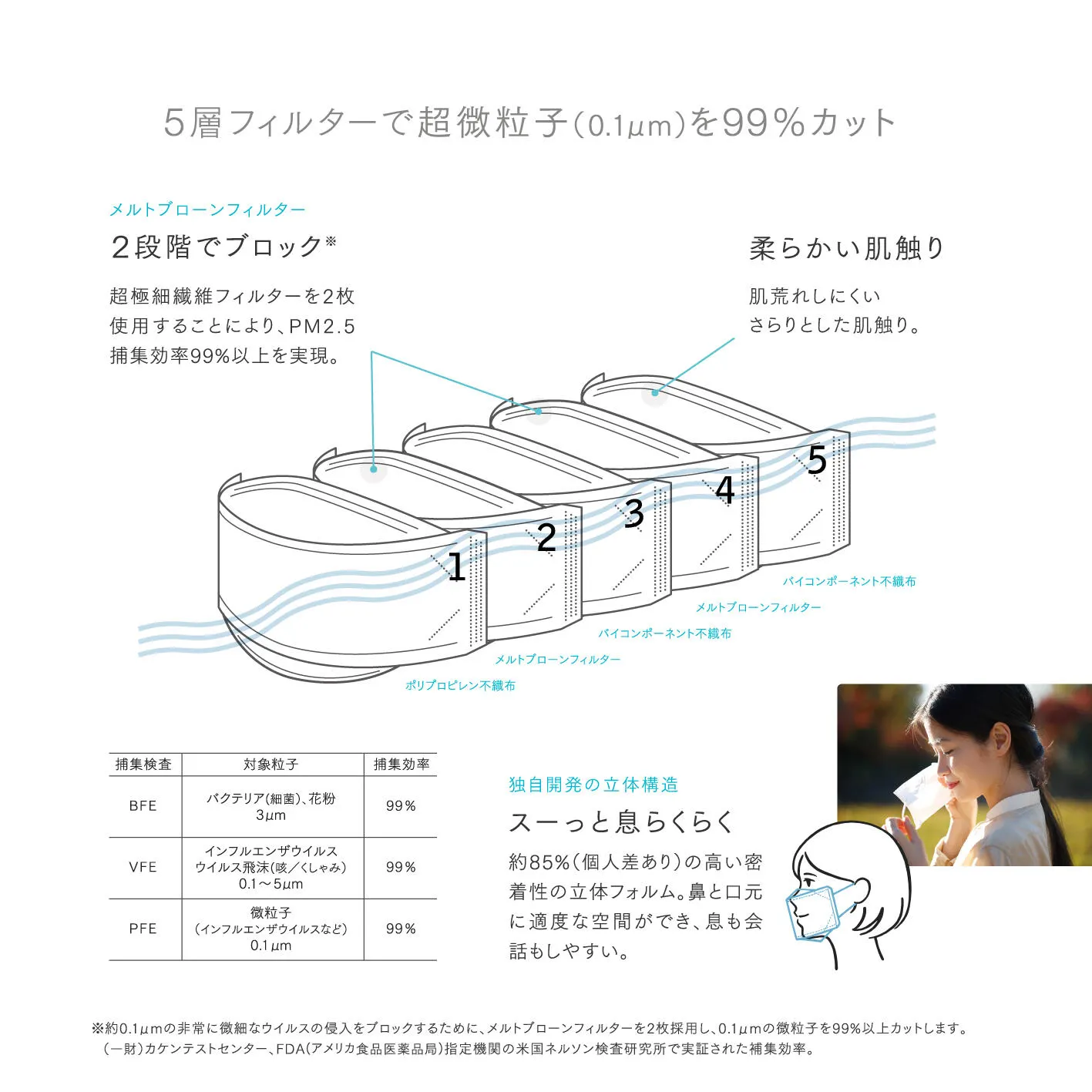 5層構造マスクの高品質で洗練された機能美。米国FDA,NIOSH認可のN95マスクを製造している台湾有数のマスク工場で生産。三面立体マスクを2003年に開発。