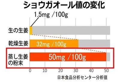 蒸し生姜は生の生姜に比べ、ショウガオールが33倍含まれています(分析センター調べ)。 蒸し生姜は中国で「乾姜」と呼ばれ、漢方にも多く使用されています