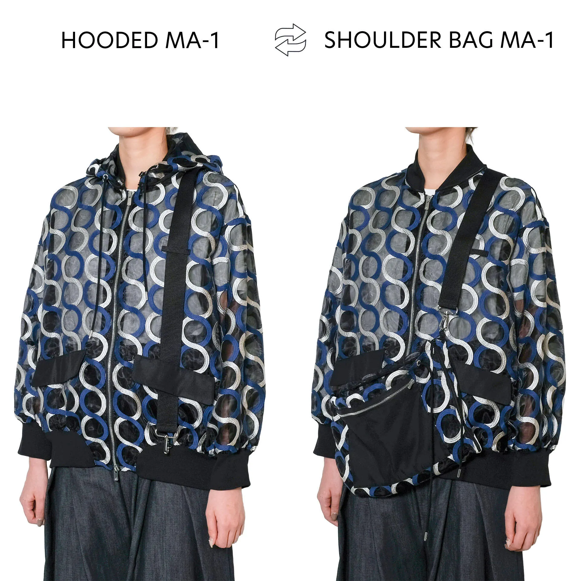 オーガンジーに2色のウェーブ状刺繍を施したオリジナルファブリックを使用した、シアー感が際立つフーデッドMA-1。