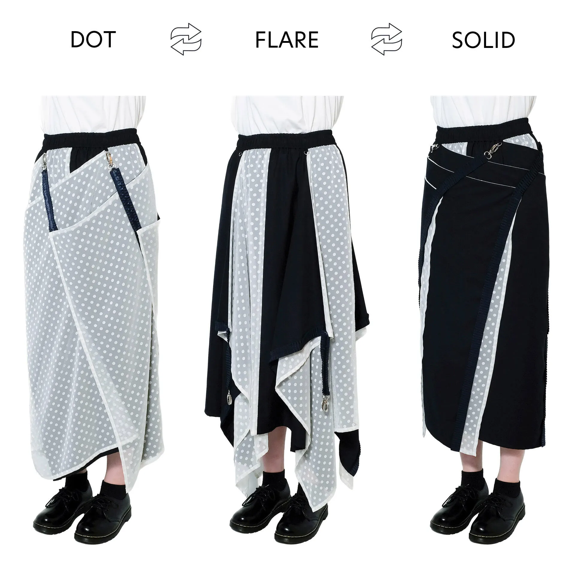 無地のラップスカートとしても、ドット柄のラップスカートとしても活躍する3WAY仕様。