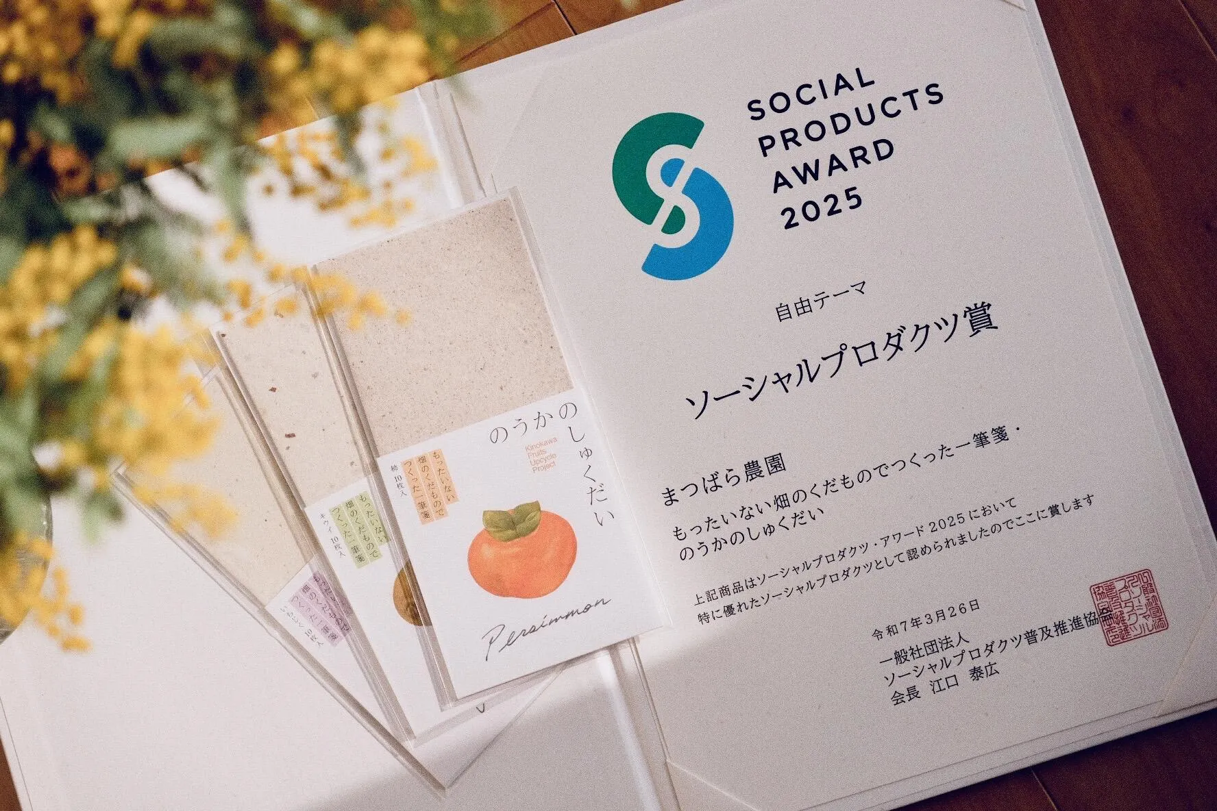 「もったいない畑のくだもので つくった一筆箋」は、その代表的な商品。柿やいちじく、キウイなど、市場に出せない果物から作られた一筆箋は、紀の川市認定ブランド【ISSEKI】にも認定され、農業廃棄物の新たな活用法として注目を集めています。ソーシャルプロダクツアワード2025、ソーシャルプロダクツ賞受賞。