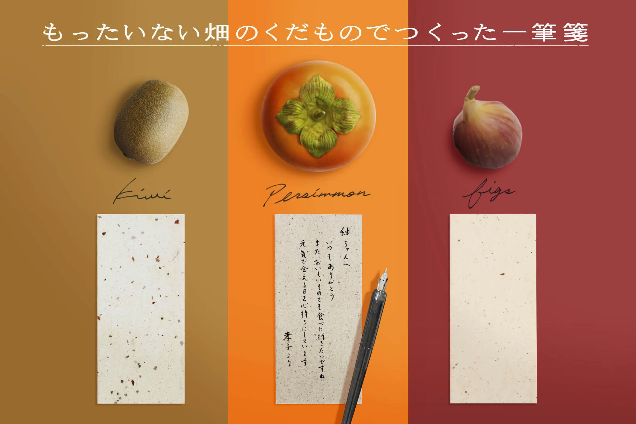 市場に出せない「規格外」の果物を活用した、サステナブルな文房具。柿、いちじく、キウイの3種類があり、それぞれの果物から作られた自然な色合いと風合いが特徴です。和紙には約30%の果実が含まれ、日本らしい温かみのある雰囲気となっています。紀の川市認定ブランド【ISSEKI】にも認定された注目商品。2025年にはソーシャルプロダクツアワード2025にてソーシャルプロダクツ賞を受賞し韓国や香港からも注目されています。一筆箋を使うたびに、農園の想いや自然の恵みを感じられる、環境にも心にもやさしいアイテムです。3種セットは贈り物としても喜ばれています。製造は福井県越前市にある1500年の歴史がある和紙会社にしていただきます。目標はダンボールの製造です。現在は一筆箋以外にもポストカードや名刺を製造中。今後はうちわや扇子などの検討中です。
