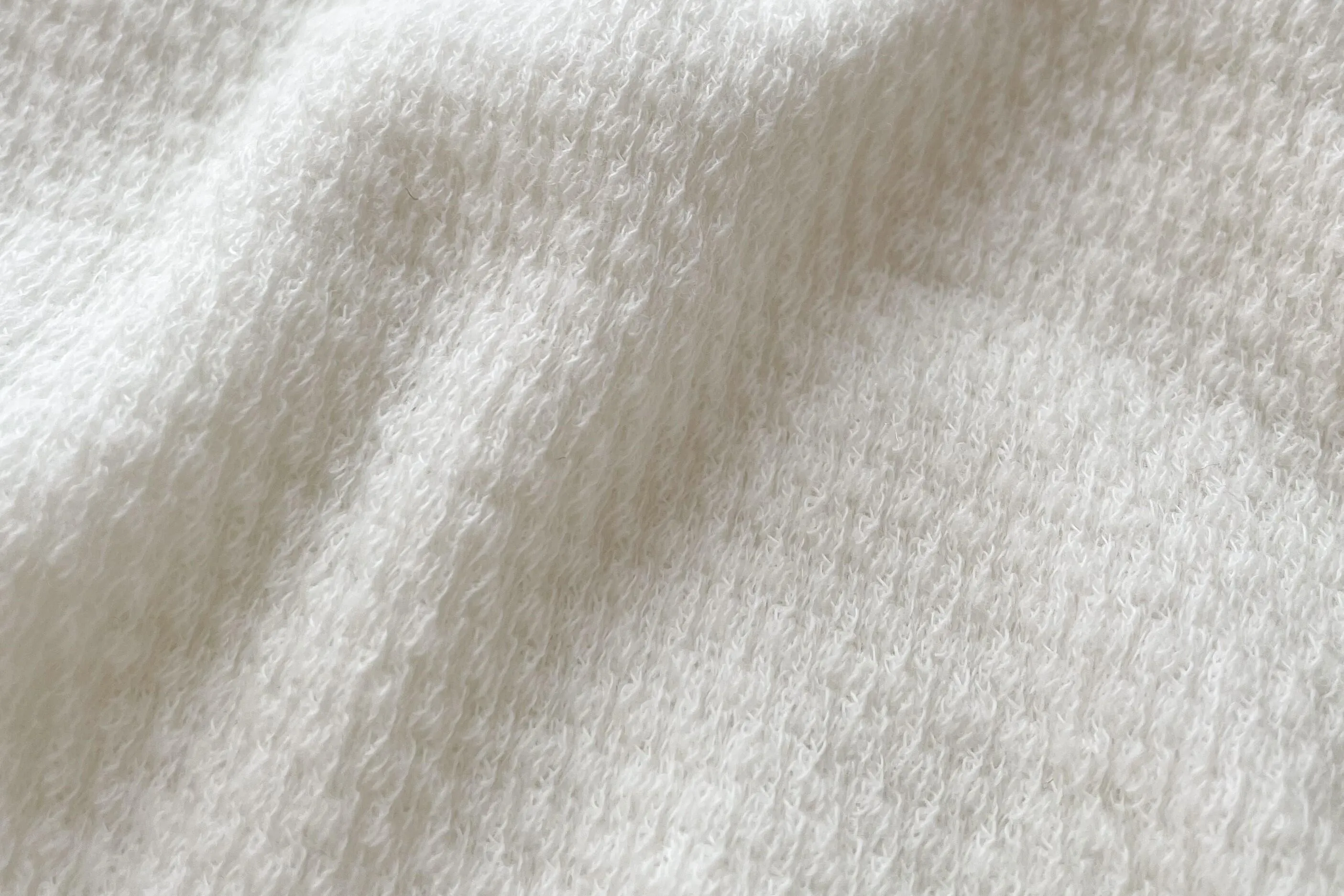 また、ワッフル生地はその名の通り、焼き菓子のワッフルのように表面が凸凹とした立体感のある素材です。日本に数台しかない貴重な編み機でゆっくりと編み立てられたワッフル生地は、素材本来の柔らかさを活かしながら、ふんわりと編み立てられています。