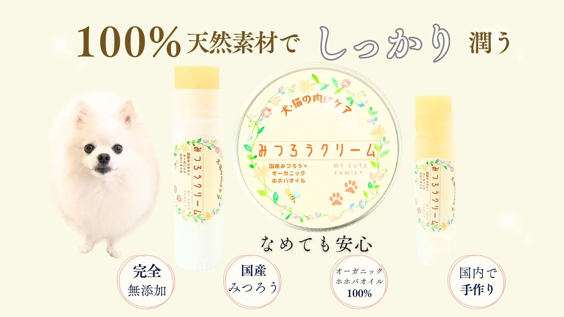 獣医師推奨の肉球クリームを製造・販売。舐めても安心な天然素材二種類、みつろうとゴールデンホホバオイルのみ使用。