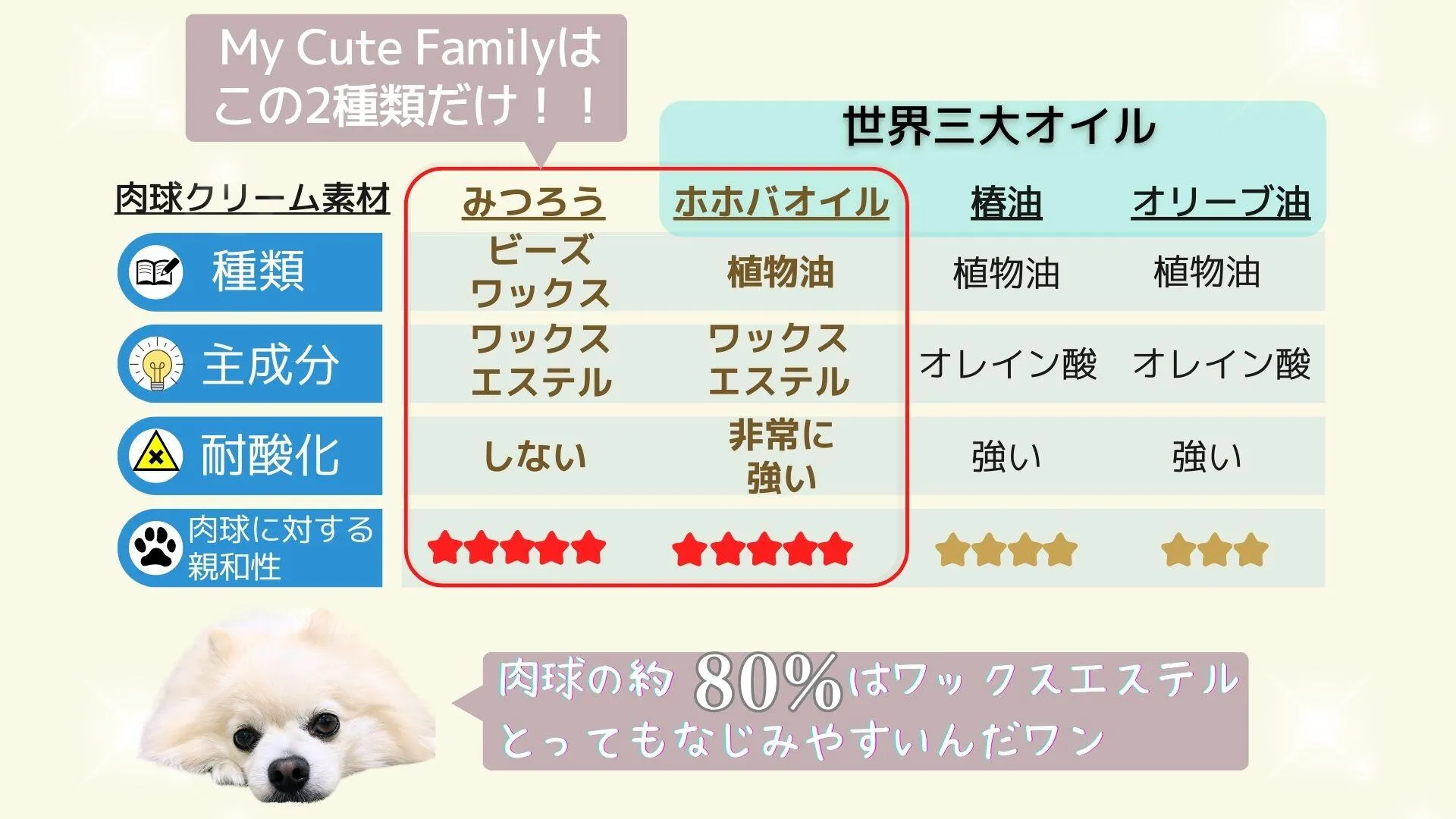 ●秘密は、主成分のワックスエステル。肉球成分は80%がワックスエステル、なのでとてもなじみやすいのが特徴。