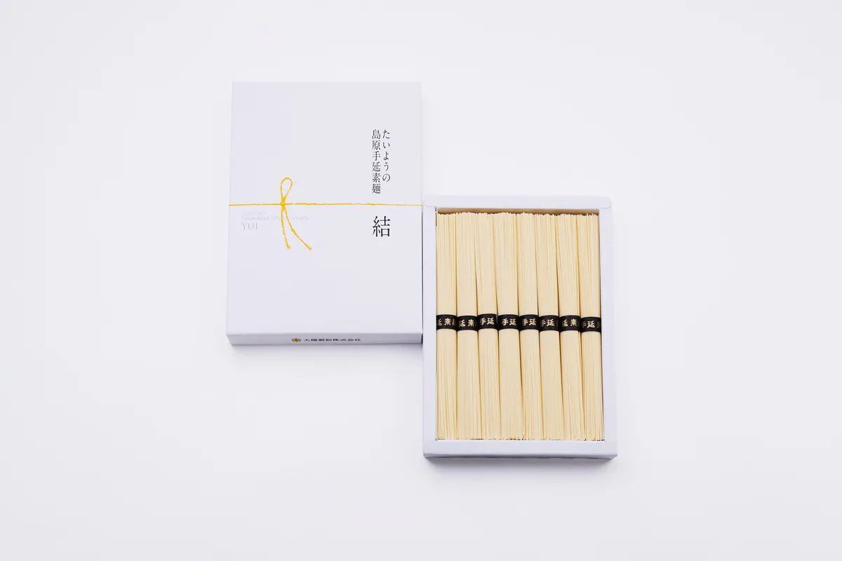 大陽製粉の「島原手延べそうめん」は、厳選小麦を自社で製粉した、こだわりの「手延そうめん用小麦粉」を使用しており、小麦の豊かな香りと食感を感じられる逸品となっております。長崎県の南東部に位置する島原半島で生産される島原手延そうめんは全国の手延そうめんの約30%を製造しています。機械製麺とは製造工程が大きく異なり、熟練した職人の手で12の工程を時間をかけて丁寧に熟成させながら作ることで、しっかりとしたコシと歯ごたえが生まれます。