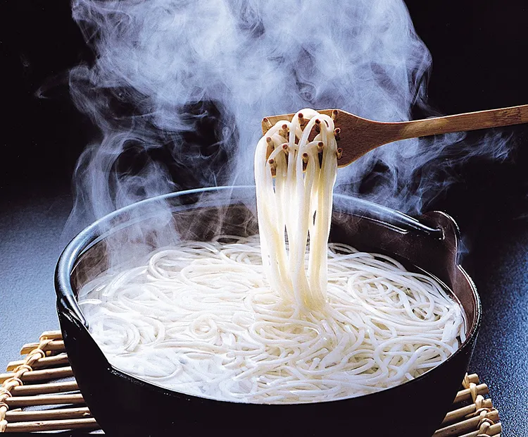 長崎県上五島市で作られる「五島手延べうどん」は幻のうどんと呼ばれ、滑らかな食感とな中に小麦の風味と椿油の味わいが特徴の手延べうどんです。