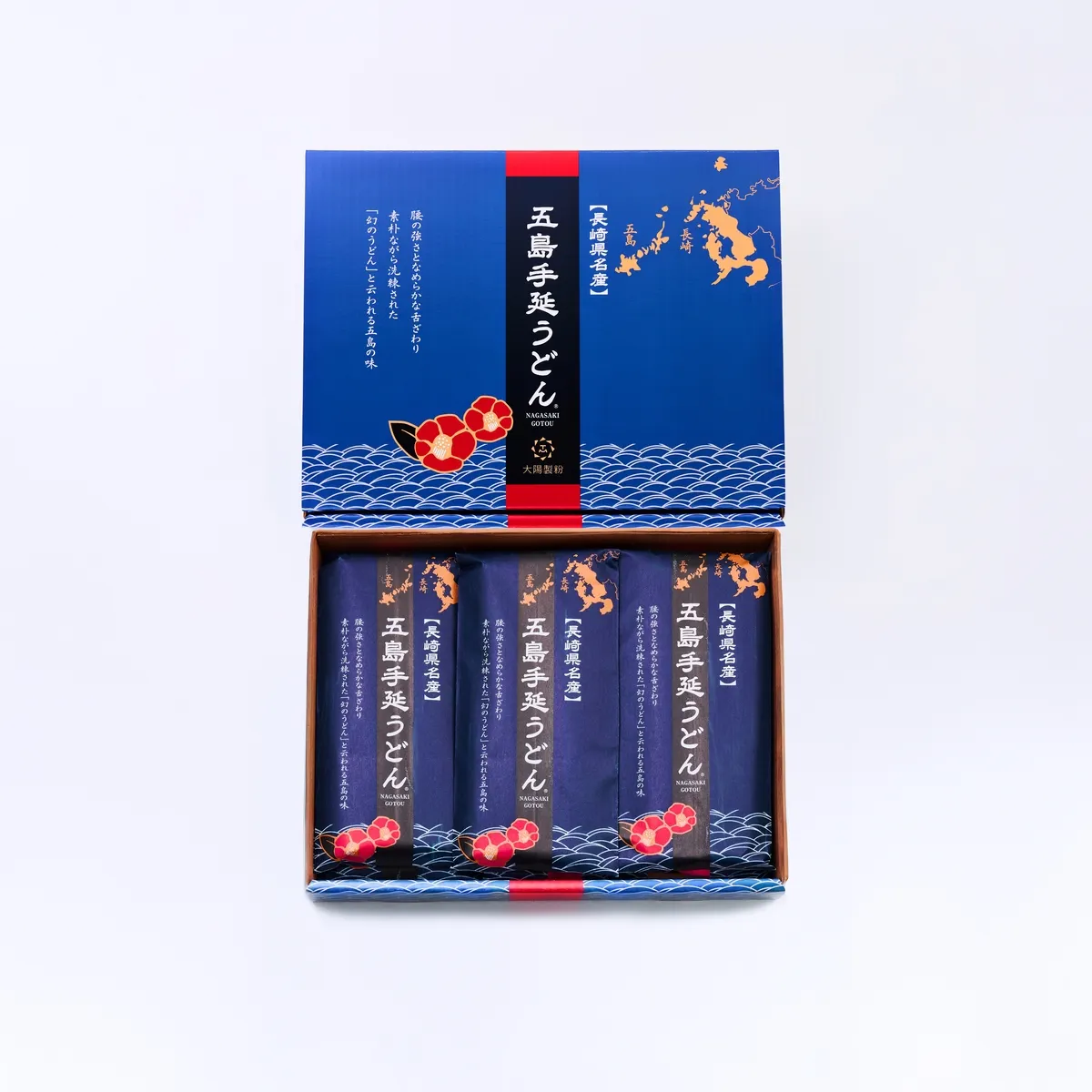 「五島うどん」は、「稲庭うどん」「讃岐うどん」に並び日本三大うどんの一つと言われております。「五島手延べうどん」は一般的なうどんに比べ、細麺で、コシがしっかりしていて喉ごしも良いのが特長です。和・洋・中のどんな料理にも生かすことができ、春夏秋冬を問わず一年中、手軽に楽しんでいただける逸品です。磁のように艶〈つや〉があり、プルンと滑らかな食感と、麺自体の持つ豊かな風味と椿油が調和して、シンプルでありながらも、奥深い味わいを引き出しているのが、五島うどん最大の特長です。