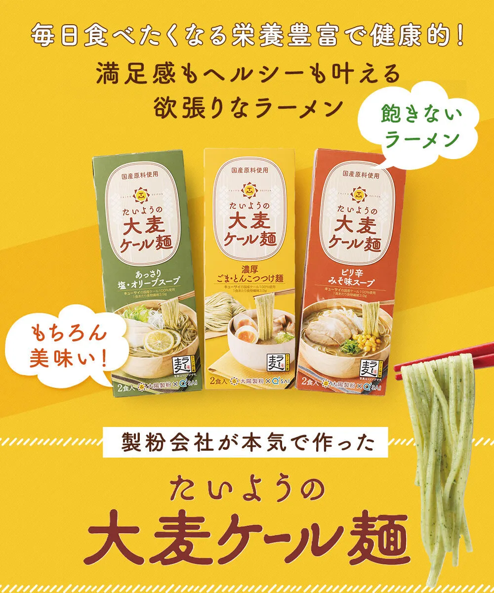 即席めんは簡単に早く調理でき、しかもおいしい!でも、栄養面が気になったり、おいしく食べた後にちょっと罪悪感を感じたりしませんか?そんな、みんな大好き即席めんのお悩みを解決する商品「たいようの大麦ケール麺」。栄養豊富で健康的、しかも美味しい!国内産の小麦粉、大麦粉をベースに野菜の王様ケールを麺に練りこんだ体においしい麺。スープはこだわりの液体スープ3つの味からお選びいただけます。