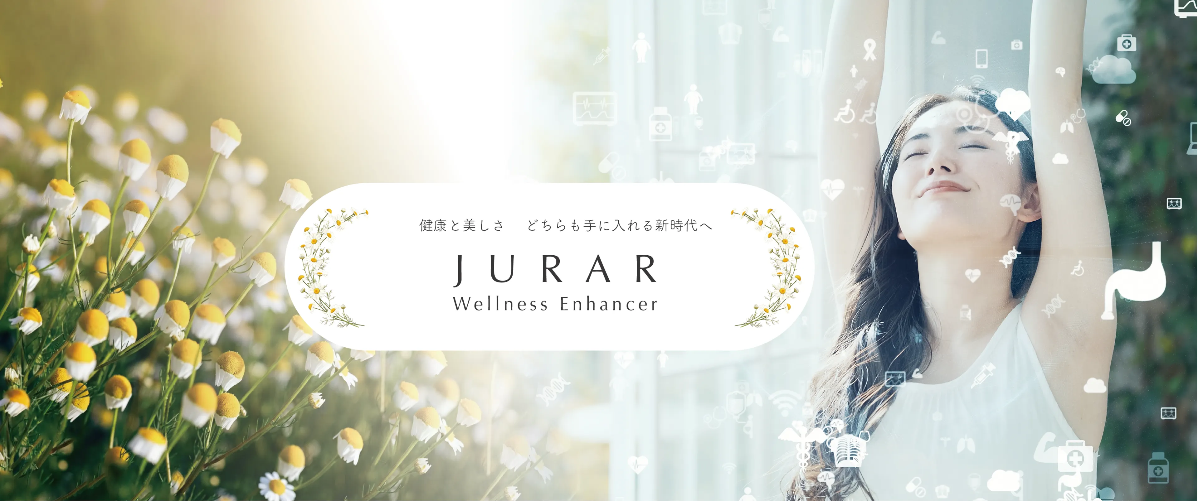 また、ブランドの象徴としてジャーマンカモミールを採用。花言葉である「癒し」「逆境に耐える」「健康」は、ストレス社会を生きる現代人に寄り添うブランドの姿勢を表現しています。JURARはスペイン語で「誓う」を意味し、「健康と美しさへの誓い」をコンセプトに、忙しい毎日でも自分らしい輝きを諦めない人々を応援します。