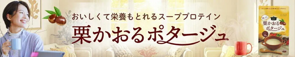 「フラールスーププロテイン 栗かおるポタージュ」は、食事の中でタンパク質・鉄分・ビタミンCを補給できる栄養機能食品のスープ。栗のやさしい香りと甘さだけでないバランスのいい塩味で、朝食やランチ、間食にも最適です。サプリメントが苦手な方や、食事から健康を意識したい方にも支持されています。