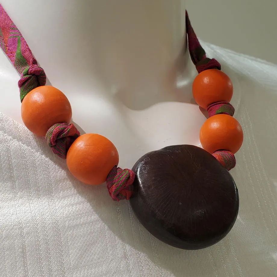 ズールーラブビーン、南アフリカの伝統布シュウェシュウェ、ウッドビーズを使っています。結び方によって長さを調整可能です。金属パーツを使っていないため、お肌の敏感な方にもおすすめです。