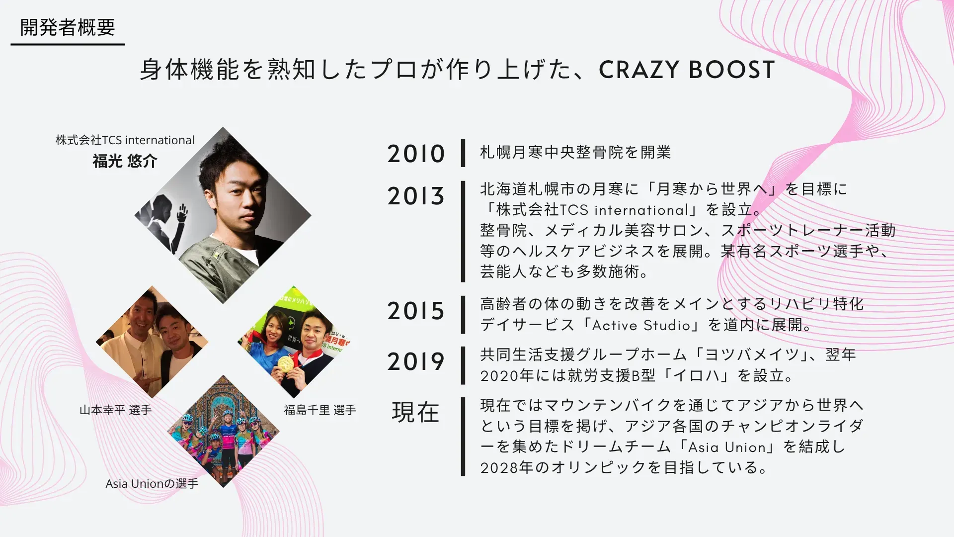 私は長年にわたり北海道にて月寒中央整骨院を開業し、様々なスタイルの暮らしを送られている方々の不調になった身体そのものを日々たくさん診てきました。その経験の中で痛感し、より深い研究と治療実践の中心になったテーマが『体の内外的健康と身体機能向上=内臓のゆがみ改善と足元から考える姿勢修整』です。またプロのアスリート方々からも専属トレーナーとしてのオファーも頂き、福島千里選手や山本幸平選手等多数の方の治療を行い、内臓機能と筋肉の関係性からパフォーマンス強化に役立てていただきました。筋肉を動かすにはエネルギーが必要です。しかし、エネルギーだけにこだわると内臓と筋肉そのものへの負担はそのままに成り実際のパフォーマンス力は落ちてしまいます!そこで今回開発した『エネルギー補給と筋肉ケア、さらに競技中のストレス軽減』を一つにまとめた製品(エナジーゼリー)がCRAZY BOOSTです!