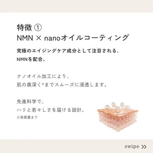 天然のヒマワリ種子油、マカデミア種子油、贅沢なローズヒップ油を最適なバランスでブレンド。話題のNMNとAPPSも独自処方で配合。