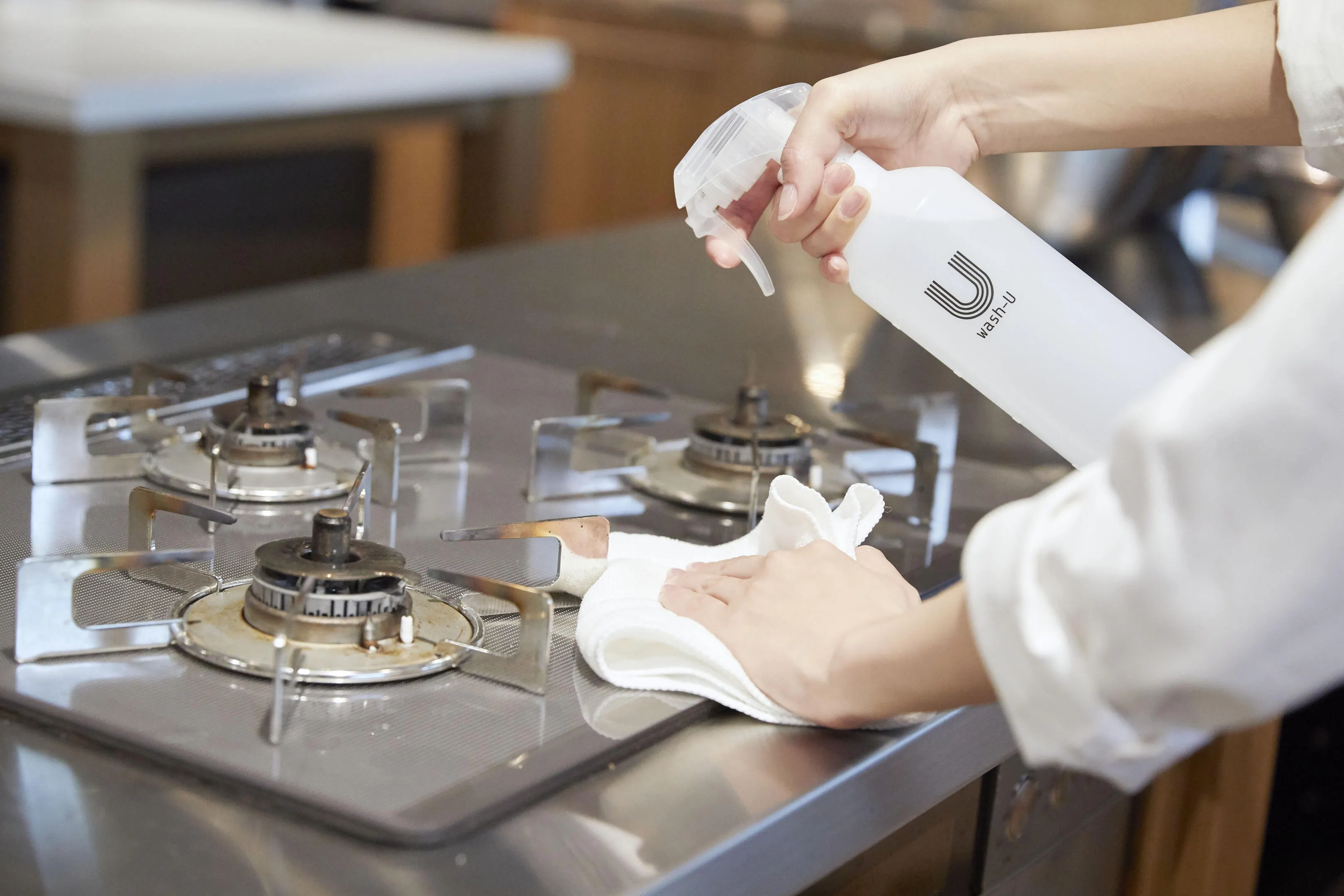 人が生活する上での汚れの9割は酸性の汚れ。その汚れを「wash-U」は中和してきれいにすることが出来ます。特に油ヨゴレには効果があり、マイナスイオンの効果で汚れを浮かして落とします。