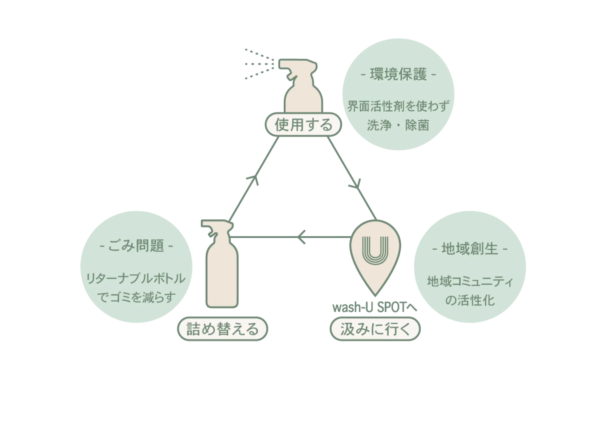 「wash-U」は中身の「水」が空気に触れていなければ、効果が落ちることはほぼありません。そのため消費期限などを気にすることなく店内で販売が可能です。