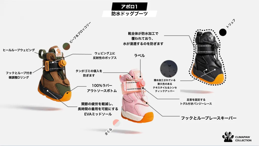 ・アッパーにはスエードやPUレザー(合成皮革)、キャンバス地を使用し、愛犬の足に有害な雨や雪、塩分を含んだ氷を遮断し、寒い季節の散歩で凍傷を防ぐ防水仕様です。