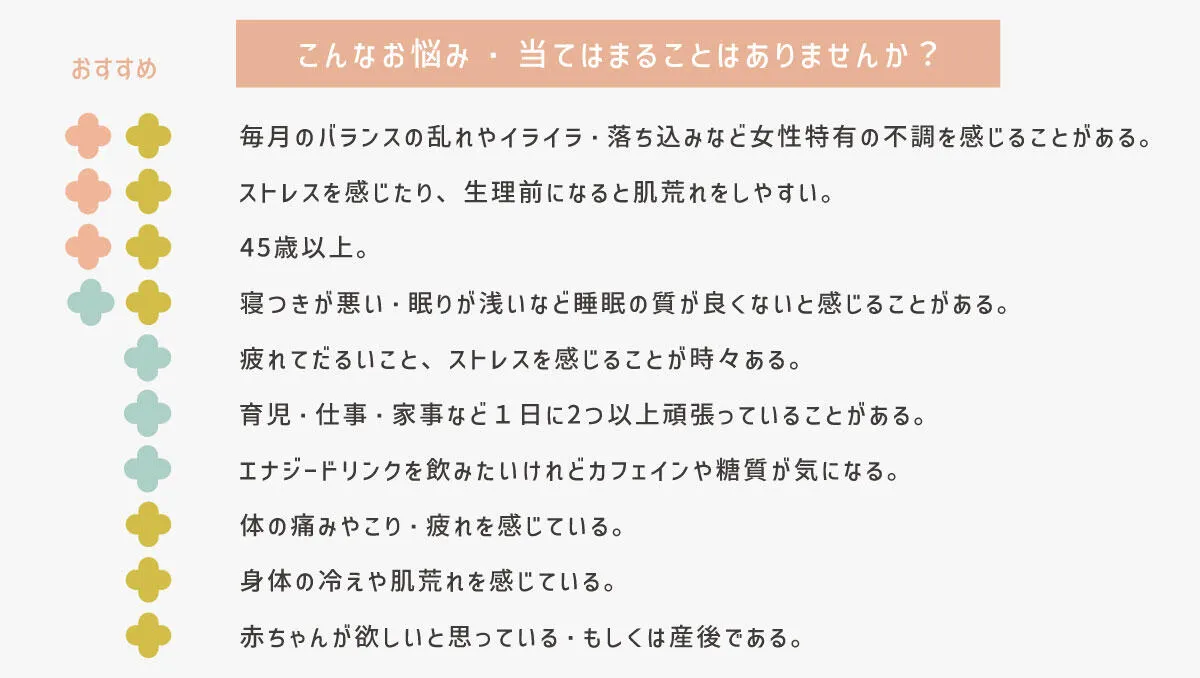 さらにザクロやリンゴ酢など自然由来の女性にうれしい成分が、カラダとココロのゆらぎなどのお悩みや美容に体の内側からやさしくアプローチします。