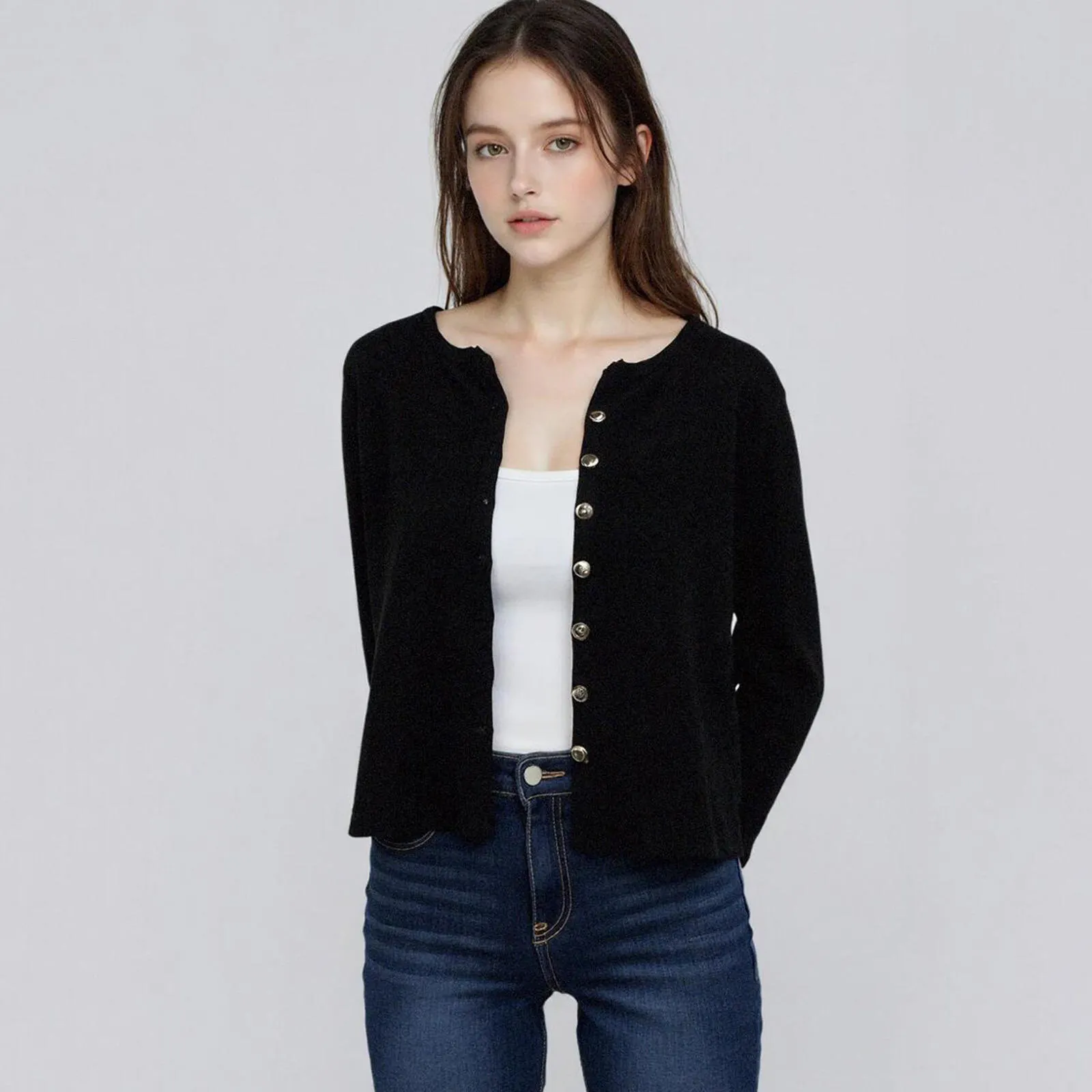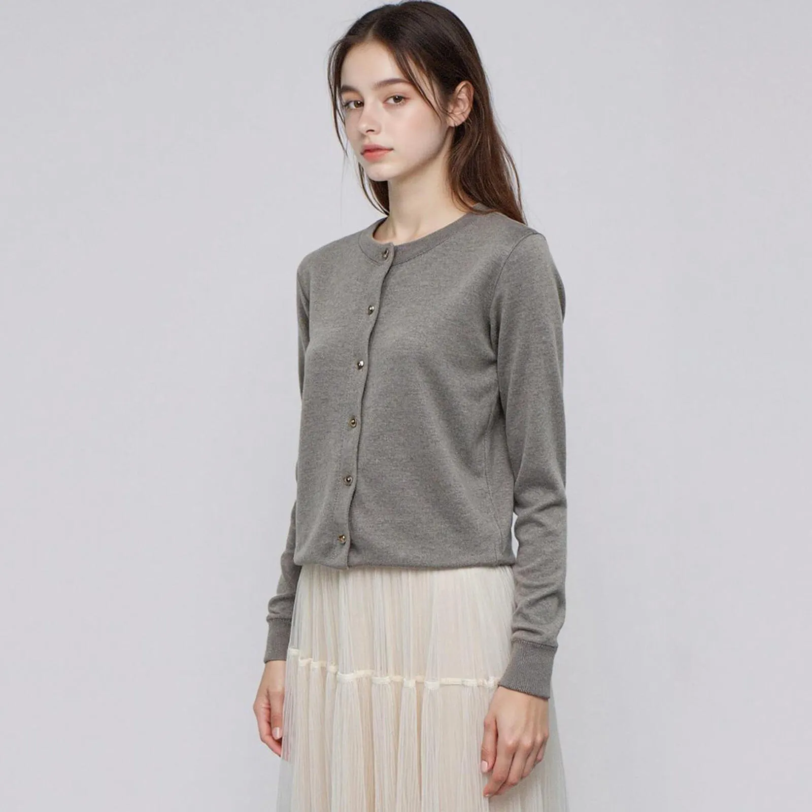 25年秋の新商品で、柔らかい素材と金色のボタンがポイントのラウンドカーディガン。