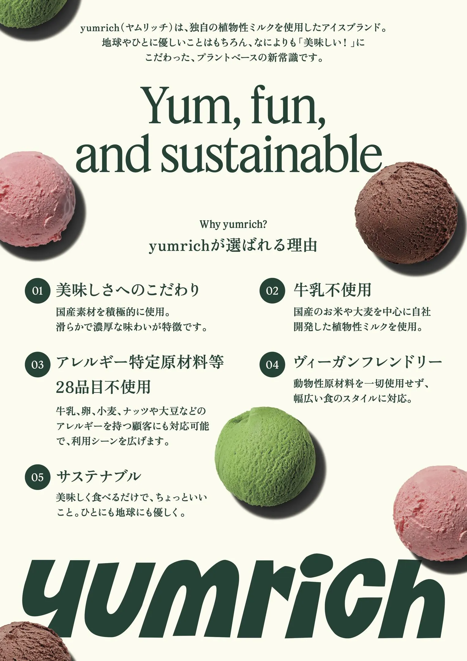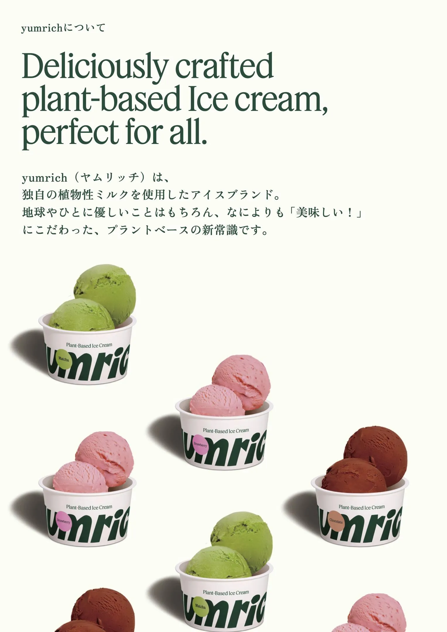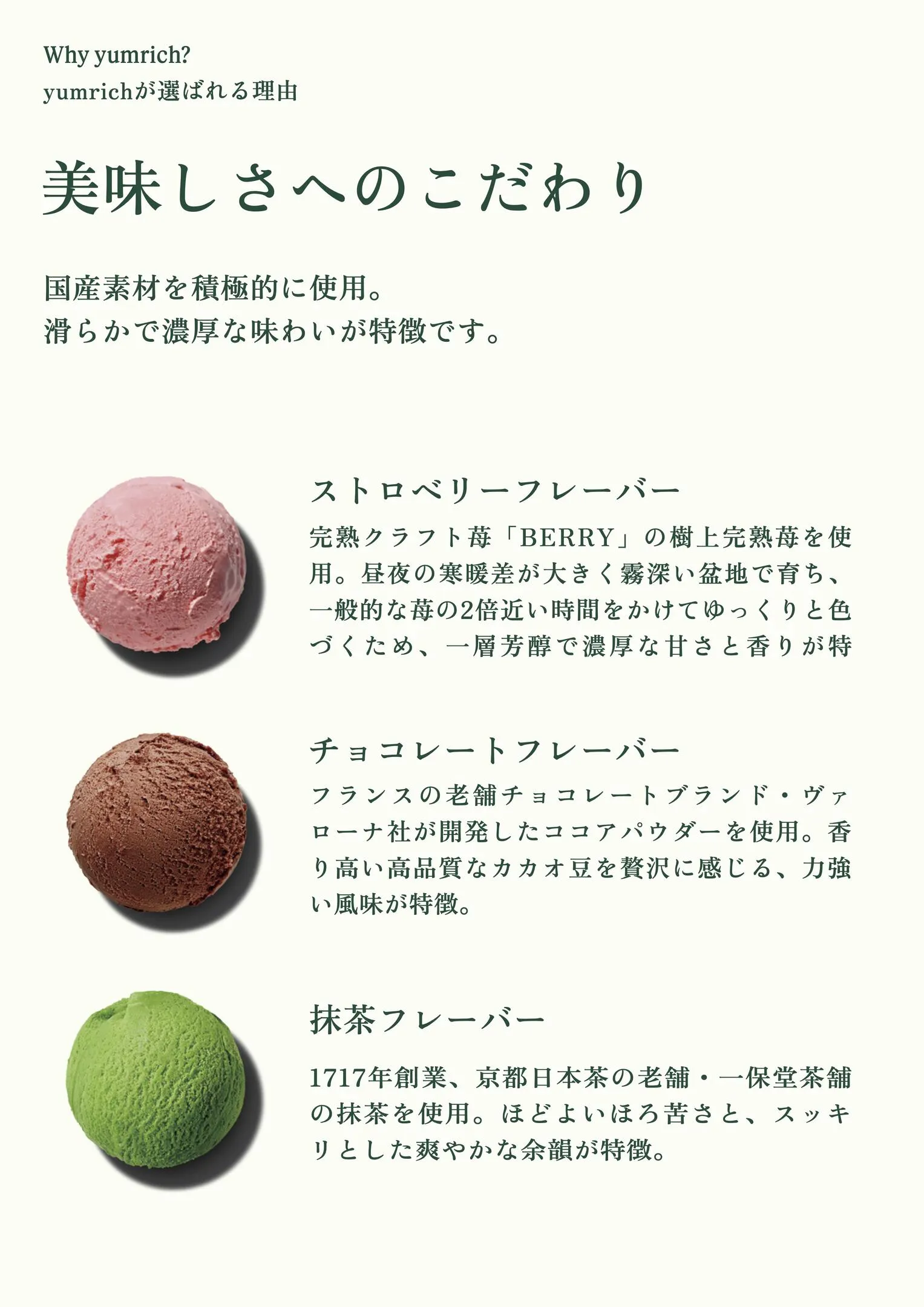 yumrichのフレーバーは、どれも「素材の力を、ありのままに届ける」ことを大切にしています。牛乳や卵、白砂糖を使わず、国産のお米と大麦から生まれた植物性ミルクをベースに、素材本来の風味と香りを最大限に引き出すレシピを採用。味づくりの主役は、名だたる生産者や老舗ブランドが手がける選りすぐりの原料たちです。私たちは、ただの“代替”ではなく、“本当においしい”を叶える植物性アイスクリームを通して、からだにも地球にもやさしい豊かさを提案しています。ストロベリー、チョコレート、抹茶──定番でありながら驚きがあるその一口に、yumrichらしい物語が込められています。