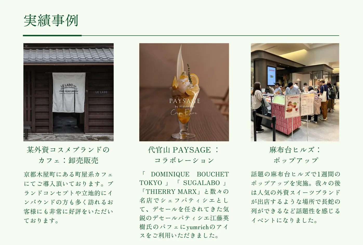 卸販売では、京都木屋町の町屋カフェなどインバウンド需要のある観光地立地にも導入されており、海外観光客からも高評価を獲得。さらに代官山のデセールレストラン「PAYSAGE」では、フランスの星付きレストランで活躍するパティシエとのコラボメニューに採用され、高級パフェの構成素材として使用されました。見た目・味ともに一流の現場で評価される品質が、信頼と共感を広げています。