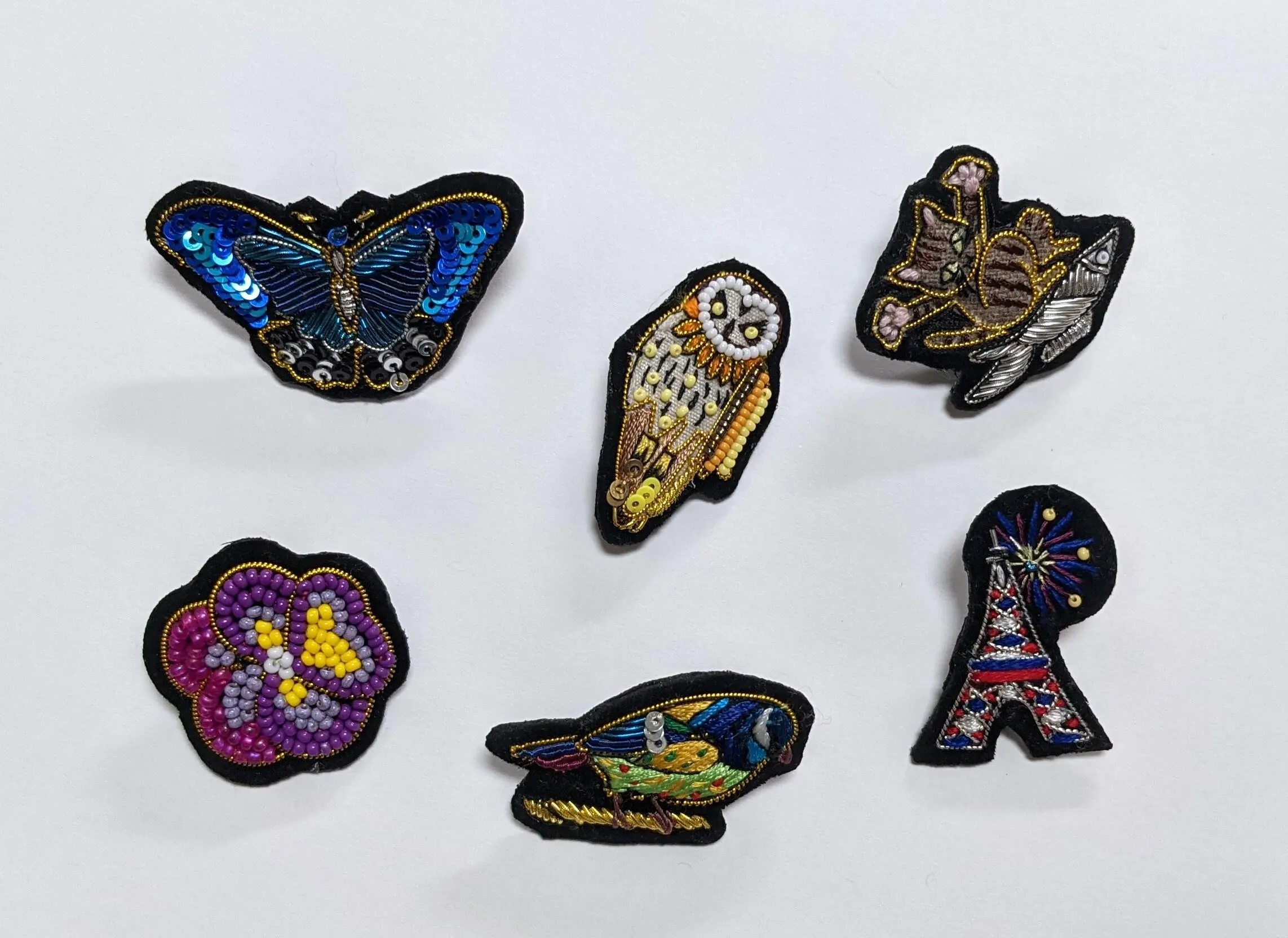 手刺繍のストールやピンバッジ、イタリアでプリントしたストール、日本製の傘は修理しながら長年ご使用いただけます。
