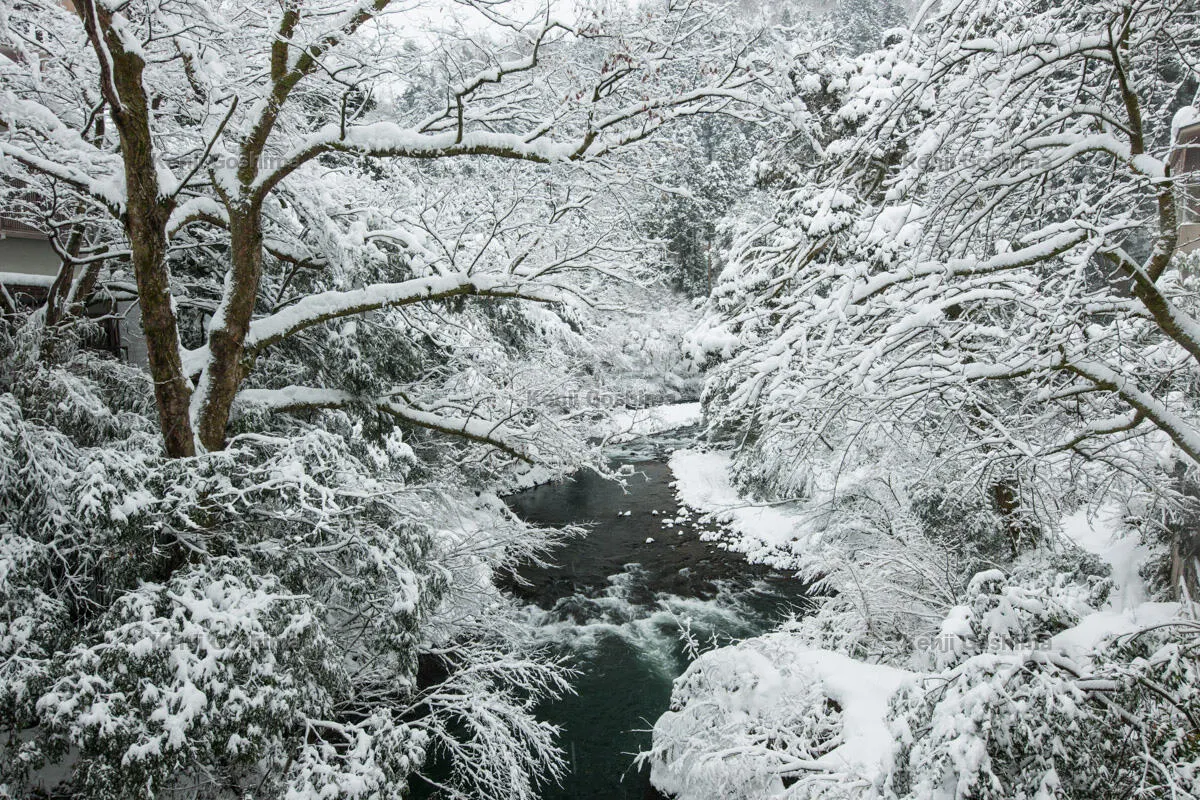 渓谷の木々に雪が降り積もった景色に光が差し込んだ「雪景色」