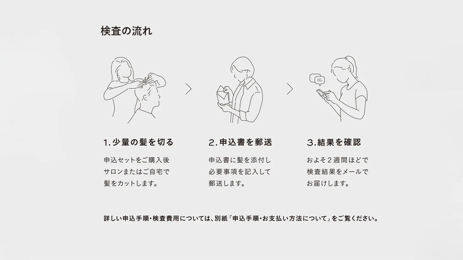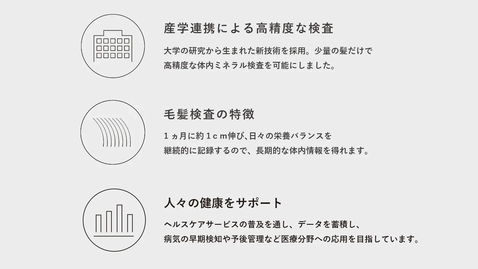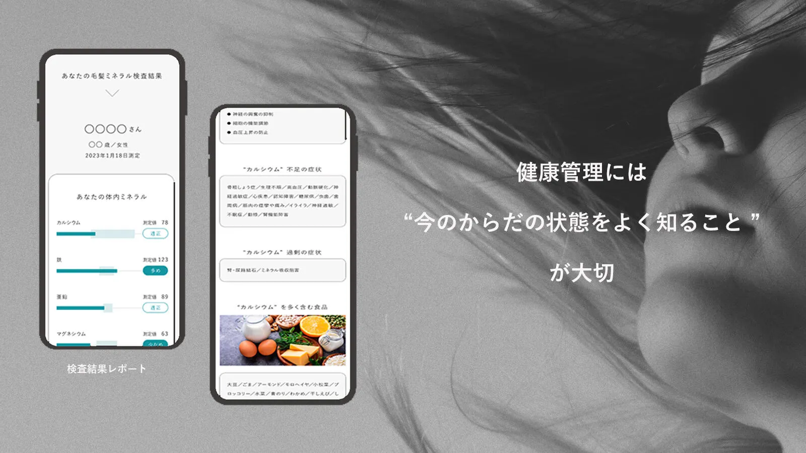 大学の研究から生まれた数本の髪を切って送るだけで、不足しがちなカルシウム、鉄、亜鉛などの体内ミネラル量を把握できる検査キット。