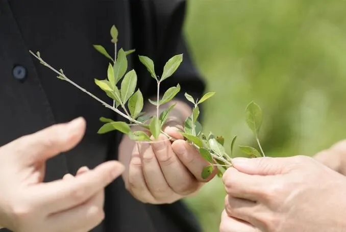 インド現地の畑と工場を実際に視察したうえで輸入した、ムギティオーガニクスのヘナ。収穫したヘナの葉は速やかに乾燥され、枝や砂などの不純物が混入しないよう、保管から粉砕、ふるい分けまでを専門工場で一貫管理しています。天然100%・ノンケミカルの植物染料にこだわり、複数の植物由来ハーブを独自にブレンド。微粉末で溶けやすく、塗布しやすい仕様に整えました。