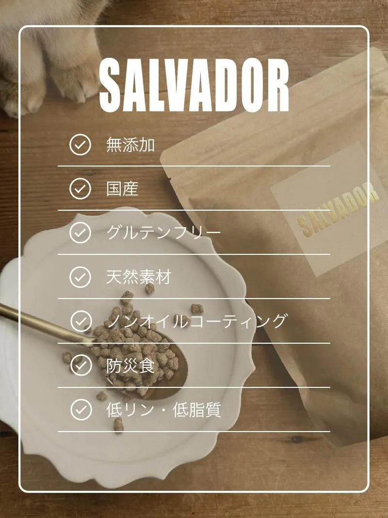 ペットフードのブランドネーム「SALVADOR」(救世主)には、目まぐるしい世の中で様々なストレスを敏感にキャッチしてしまう愛犬愛猫が、いつまでも穏やかにストレスフリーで暮らせるように、そしてどんな状況下になっても必ず命を救えるようにという願いを込めています。