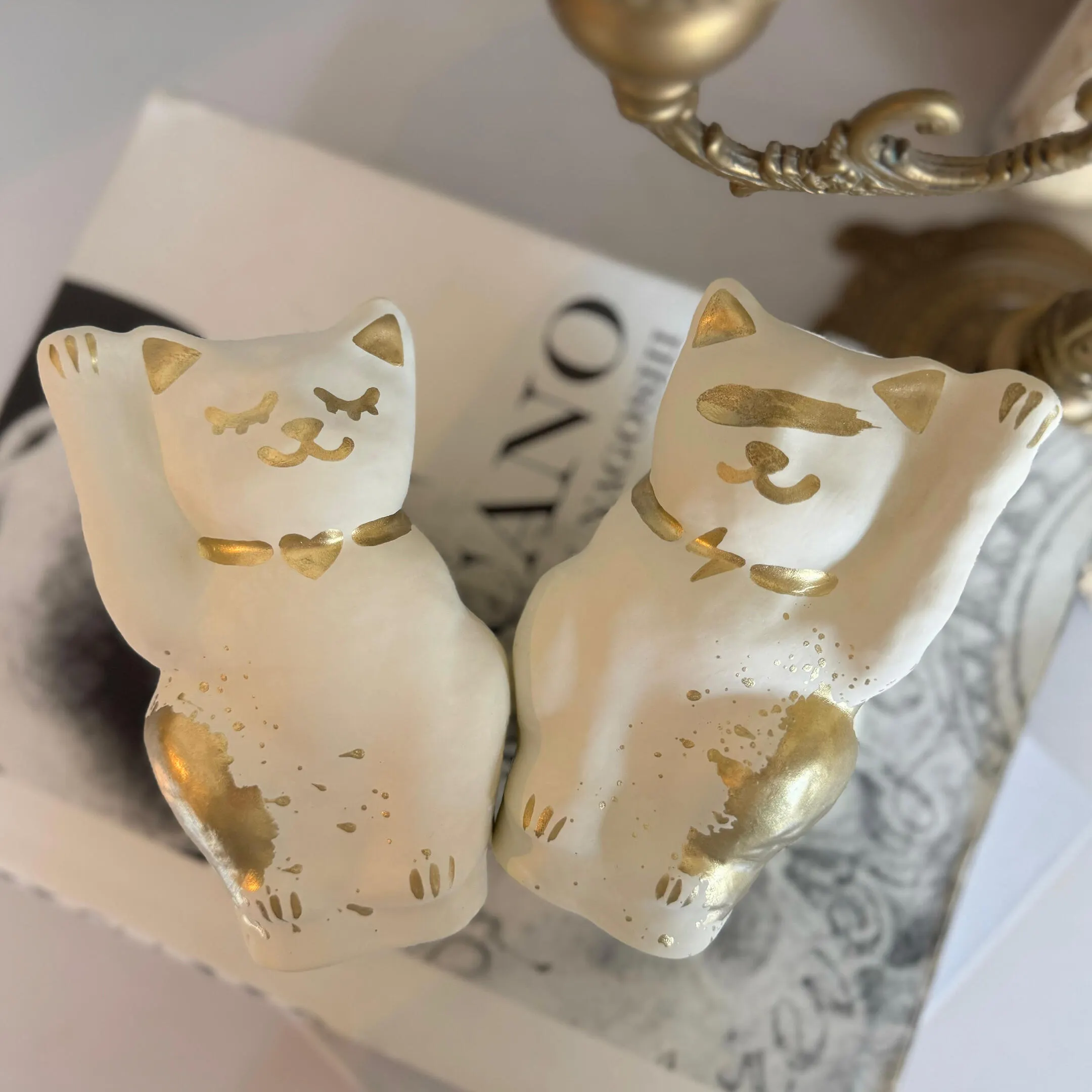 そんな高崎だるまを100年余り作り続ける老舗名店とPOPPYS HOUSEがコラボした招き猫です。ナチュラルなコットンホワイトに上品なゴールドを纏った癒しモダンなデザイン。招福招き猫の『スリーピーちゃん』と、右上がりの目線がトレードマークの商売右肩上がり『サンダーバディ』の2種類をご用意しております。職人さんが一つ一つ丁寧に絵付けして作り上げた一点物、オンリーワンの作品です。
