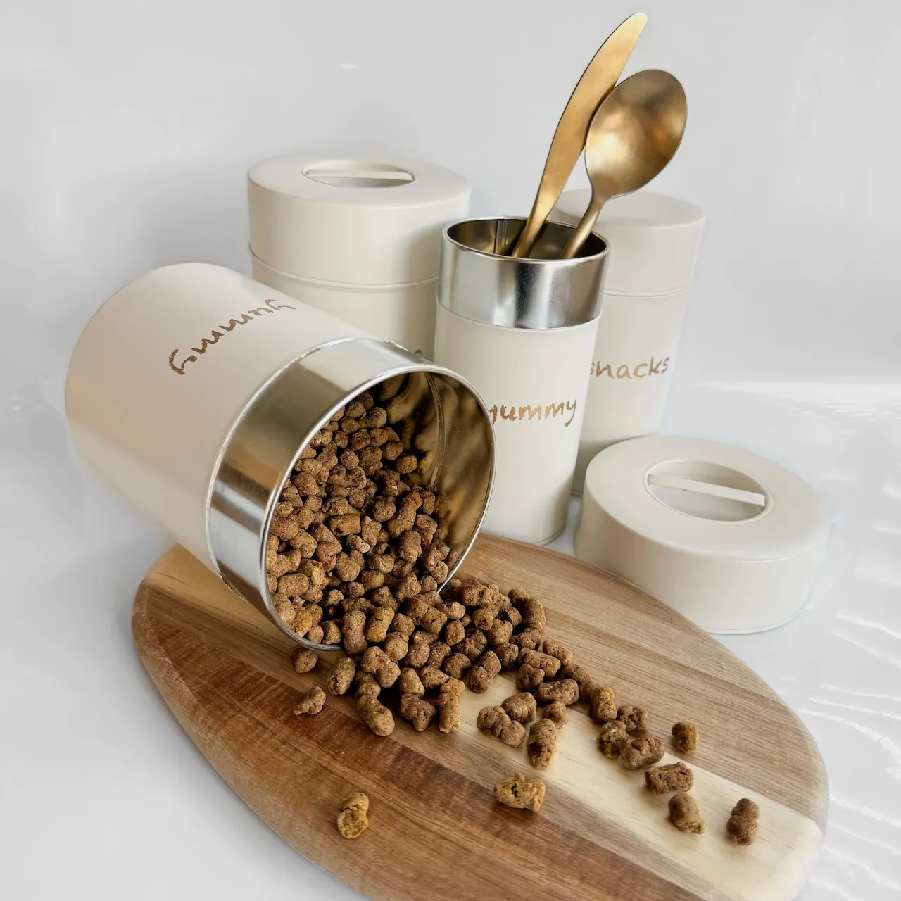 スタイリッシュなデザインと機能性を兼ね備えた「おやつ缶」は、おやつの保存だけでなく、インテリアとしても映えるアイテムです。S・Lサイズの2種類があり、「SNACKS」「YUMMY」のデザインからお選びいただけます。おやつと一緒にセットにした「おやつ缶&おやつセット」も人気で、特別な日のギフトとしても喜ばれています。