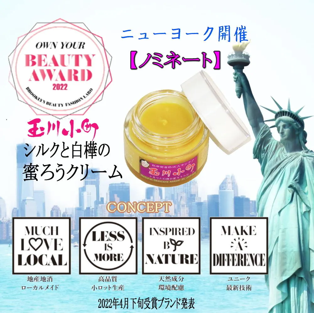 2022年玉川小町クリームは、ニューヨークの『Own Your Beauty Award 2022』にノミネートされ、ブルックリンのショップにて展示販売も行っております。