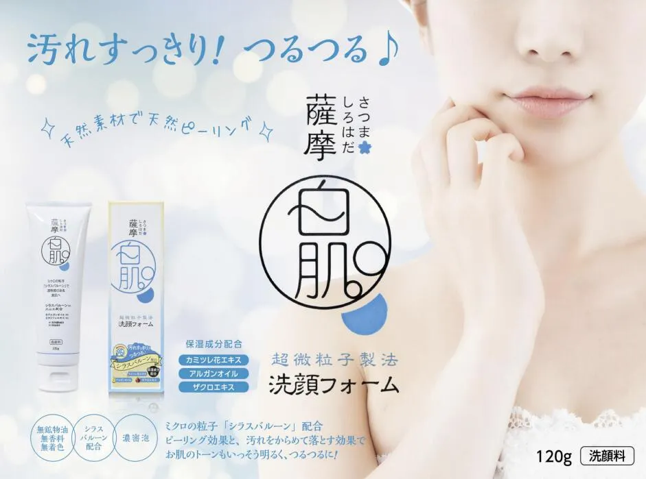 「薩摩白肌」はお肌にやさしい天然のミネラル分を豊富に含んだシラスバルーン(桜島火山土)を独自の製法で超微粒子化した自然派洗顔フォームです。