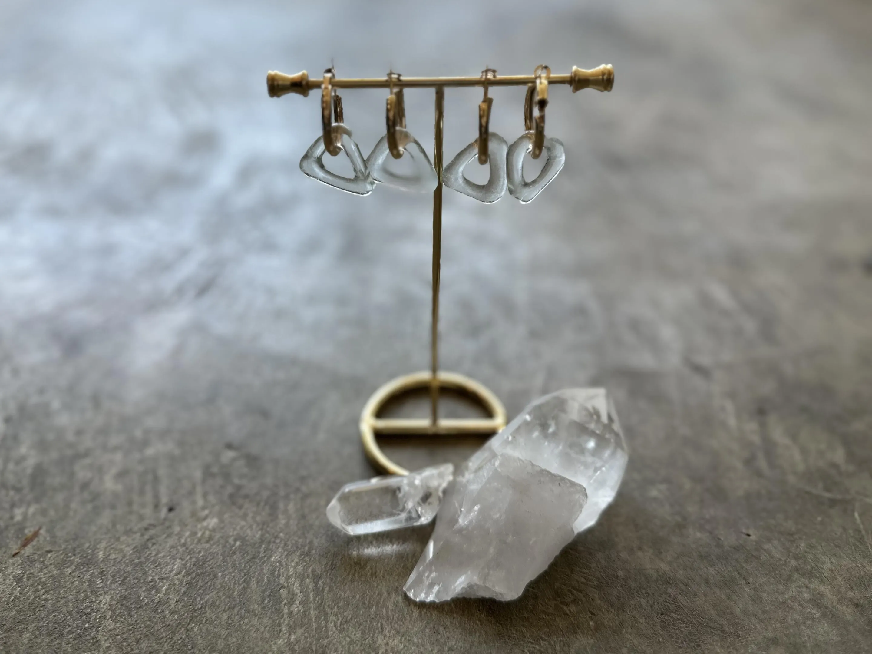 ガラスに関しての発明を数多く残されている85歳のガラス作家さんと共同で作らせていただいたガラスのピアス。陽の光でキラキラときらめき、耳元を揺らします。