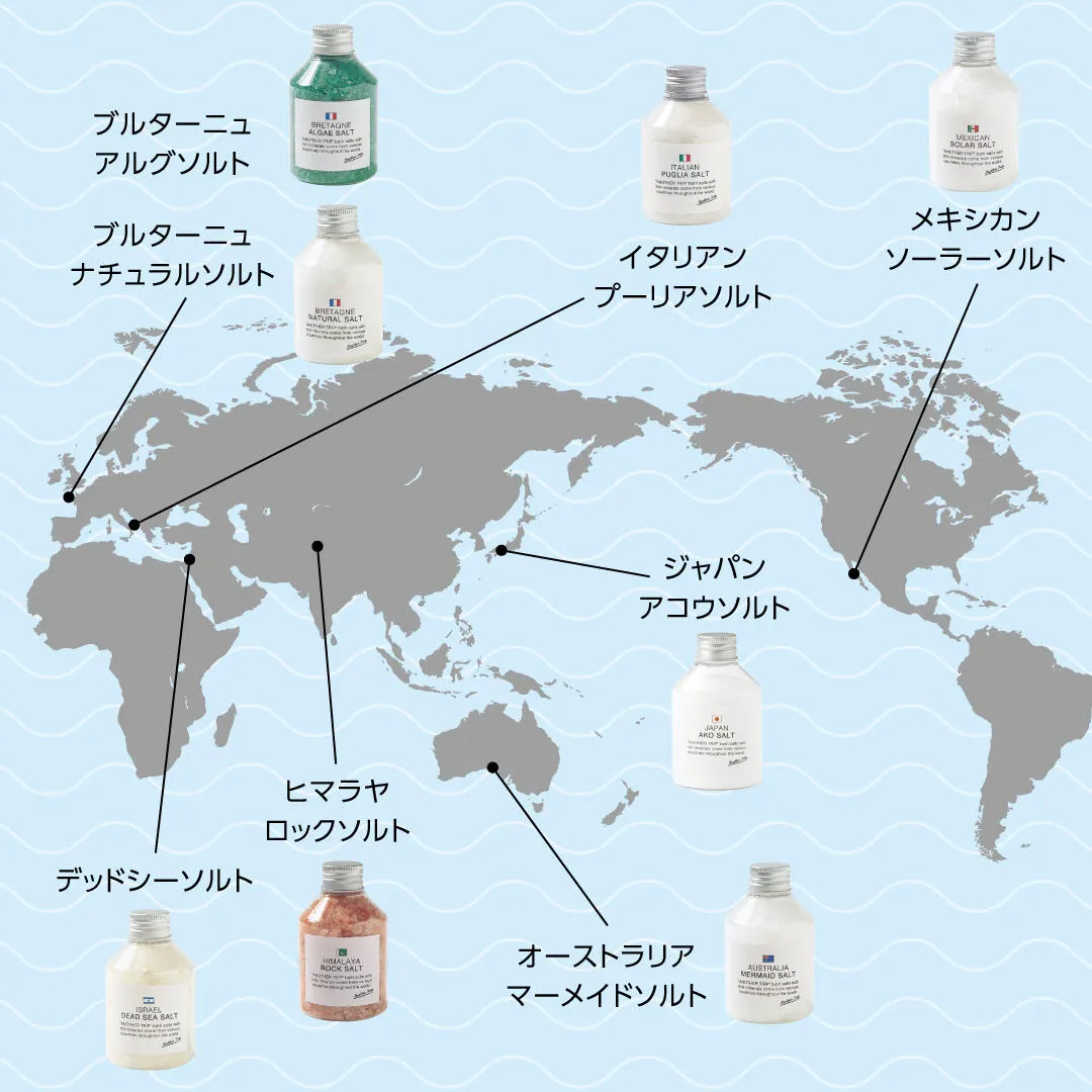 それぞれの国で採れた自然塩を我が家のバスタブで楽しめます。