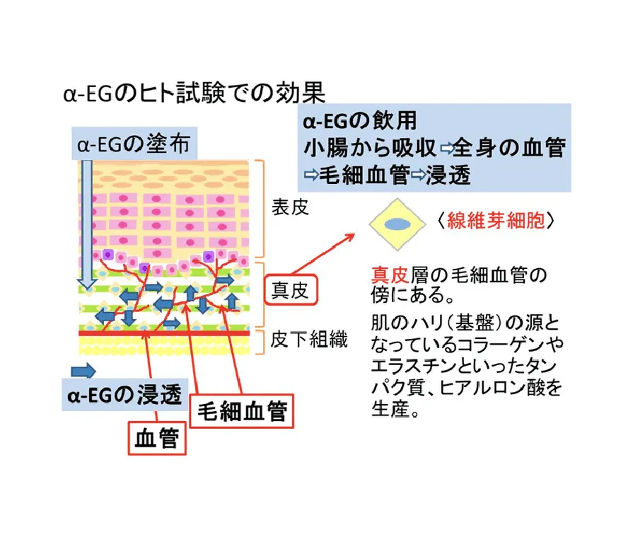 研究結果によると、α-EG を飲用すると、その成分は小腸から吸収されて全身の血管を通じて毛細血管まで運ばれ、さらに毛細血管付近にある線維芽細胞を活性化してくれるそうです。線維芽細胞は肌のハリの源となるコラーゲンやエラスチンなどのたんぱく質、ヒアルロン酸を生成する細胞です。