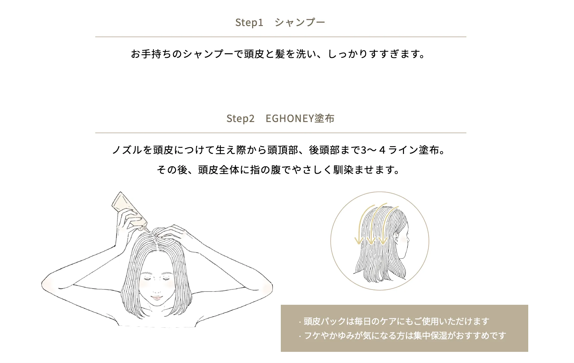 α-EG(日本酒)×HONEY(はちみつ)のチカラで、頭皮にハリと弾力を与えます。フケやかゆみ、髪のへたりなどにアプローチ。頭皮の保湿パック 「EGHONEY」